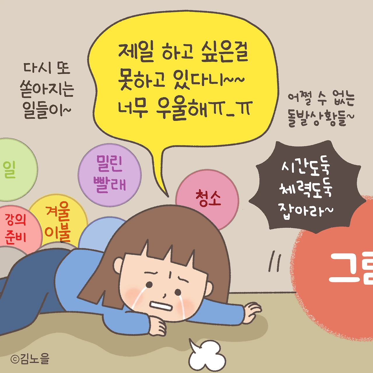 2주만에 업로드~~!! 시간 도둑들 때문에 정말로 하고 싶은 일을 못하게 되니 우울한 마음이 들었어요. ⠀ 독감이 괜찮아지고 시어머님 병원일정에 강의일정에 겨우 내 시간을 만들어 두었는데 ㅠㅠ ⠀ 바쁠때는 항상 이런 상황이 세트로 찾아와서 정신없게 하고 이런 어쩔 수 없는 돌발상황에 끌려다닐 수 밖에 없게 되죠~ ⠀ ⠀ 이제는 예전처럼 조급해 하고 신세한탄하며 내 마음을 괴롭히고 힘들게 하지 않으려구요~