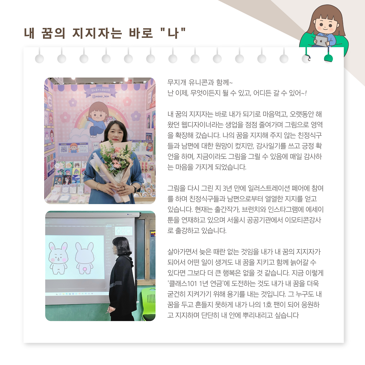 살아가면서 늦은 때란 없는 것임을 내가 내 꿈의 지지자가 되어서 어떤 일이 생겨도 내 꿈을 지키고 함께 늙어갈 수 있다면 그보다 더 큰 행복은 없을 것 같습니다. 지금 이렇게 '클래스 101 1년 연금'에 도전하는 것도 내가 내 꿈을 더욱 굳건히 지켜가기 위해 용기를 내는 것입니다. 그 누구도 내 꿈을 두고 흔들지 못하게 내가 나의 1호 팬이 되어 응원하고 지지하며 단단히 내 안에 뿌리내리고 싶습니다.