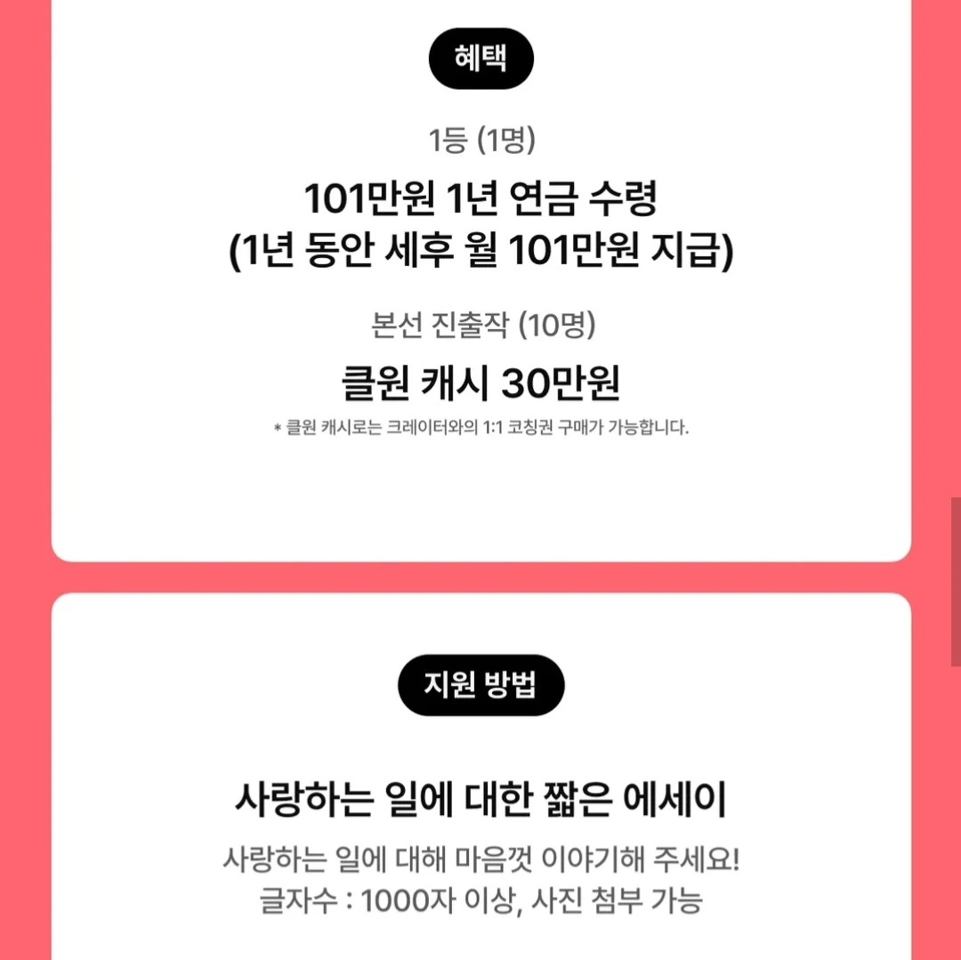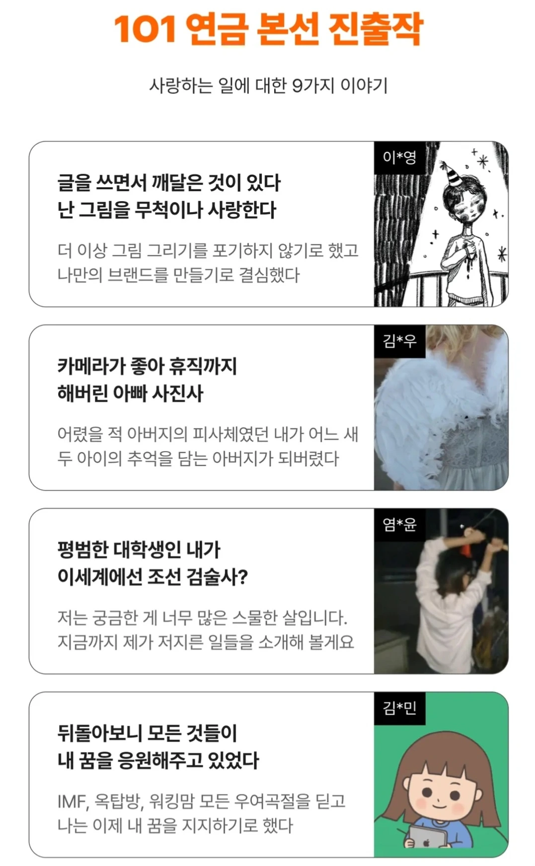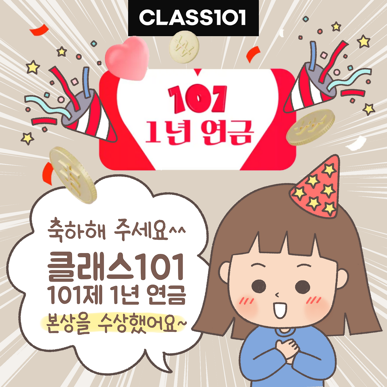 사랑하는 일에 대한 짧은 에세이와 1년 연금사용 계획서를 제출했는데 클래스 101 1년 연금 공모전에서 본상(10명)을 수상했습니다. 내가 좋아하는 일로 돈을 벌고 그 돈으로 다시 좋아하는 일을 하는 삶!! 생각만 해도 너무 멋진 일입니다. 올해는 굿즈 사장님이 되는 쪽으로 포지션을 잡았는데, 이 계획서에 조금씩 궤도를 수정하면서 앞으로 나아갈 수 지표가 되어 줄 것 같습니다.
