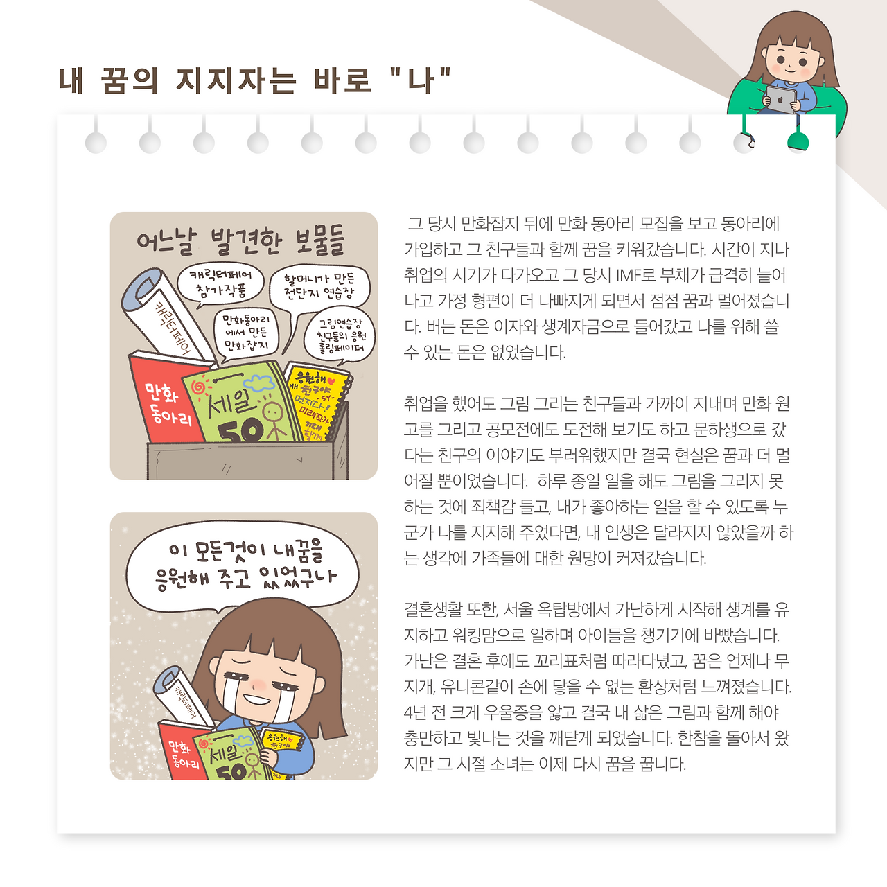 내 꿈은 만화가 그림을 그리는 게 어릴 적부터 너무 좋았습니다. 만화를 좋아하게 된 것은 6살 오빠를 찾으러 간 만화방에서 캔디캔디를 보고 나서부터였습니다. 아버지의 잦은 음주로 인해 집은 언제나 지옥이었고, 그런 환경에서 성장하면서 늘 우울했습니다.