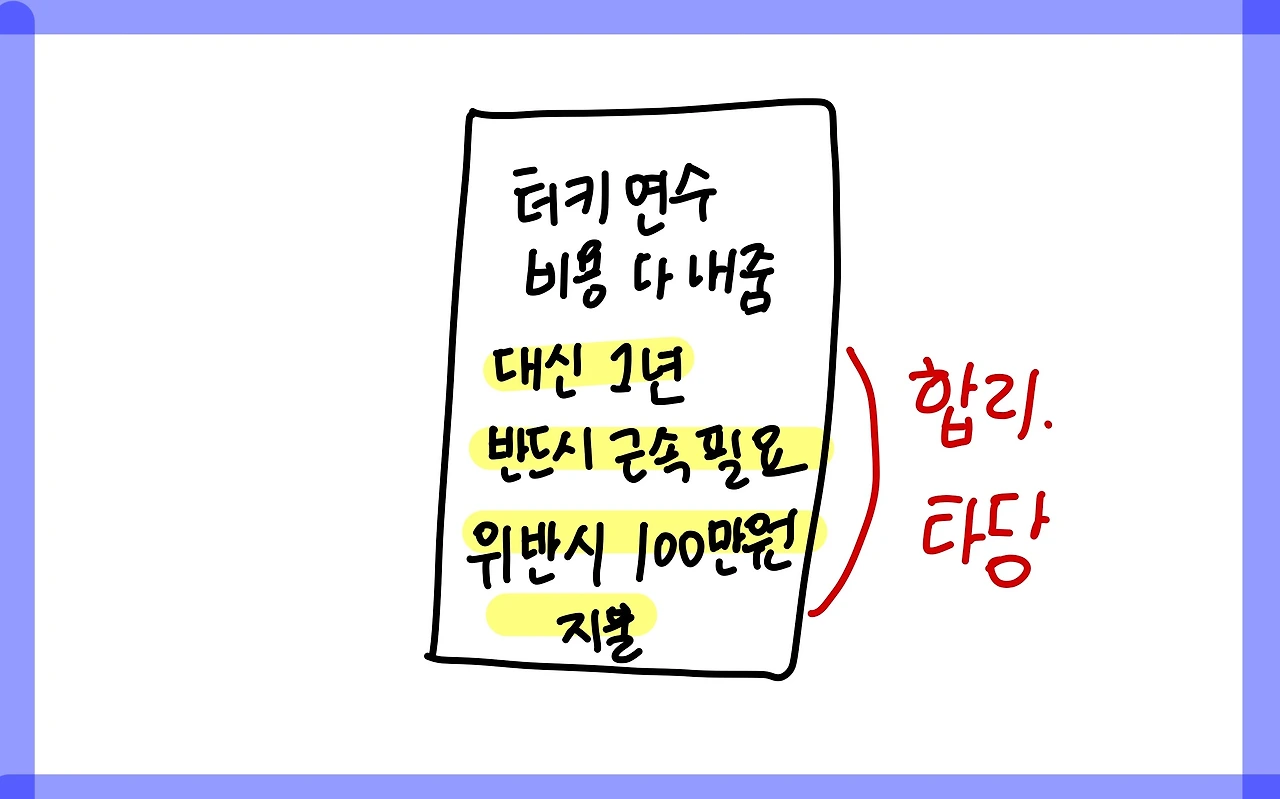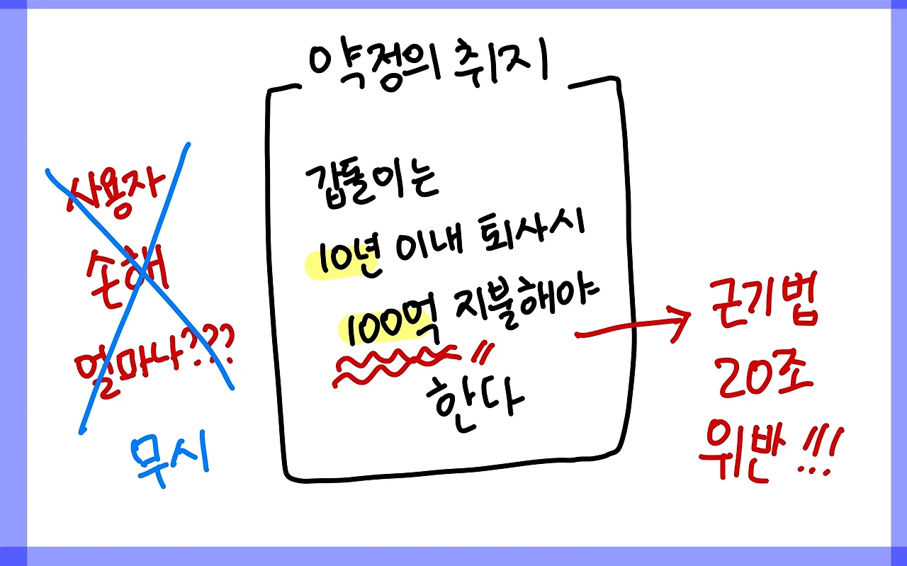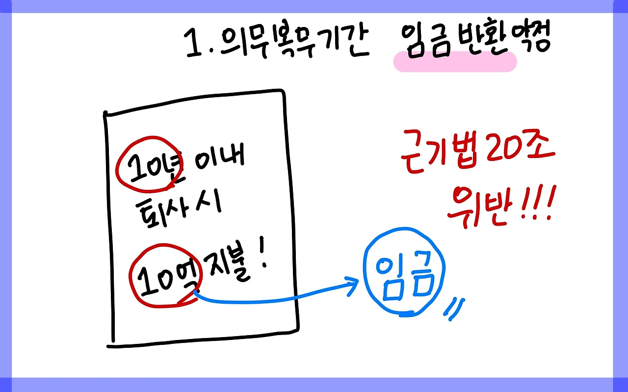 약정의 취지가 약정한 근무기간 이전에 퇴직하면 그로 인하여 사용자에게 어떤 손해가 어느 정도 발생하였는지 묻지 않고 / 바로 소정 금액을 사용자에게 지급하기로 하는 것이라면 / 이는 명백히 근로기준법 제20조에 반하는 것이어서 효력을 인정할 수 없다.