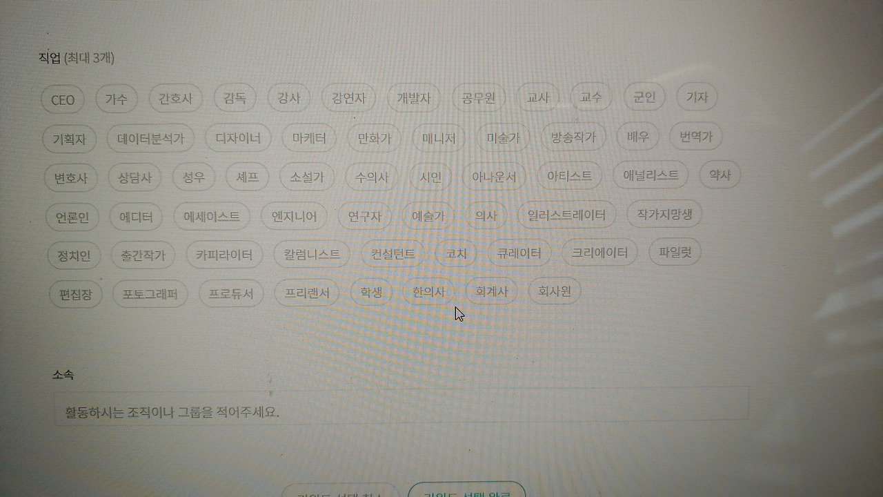 CEO, 가수, 간호사, 강사, 강연자, 개발자, 공무원, 기획자, 마케터... 눈이 아른거리게 잔뜩 떠있는 직업들이 선택을 기다리고 있었다. 그런데 나는 그 많은 것들 가운데 어느 한 가지도 선택하지 못했다. 이전의 직업을 선택하기도 애매하고 그렇다고 딱 들어맞는 직업도 없었다. 억지로 빌붙어 보려고 프리랜서나 크리에이터를 선택할까 싶었지만 그것도 사실은 내키지 않았다.