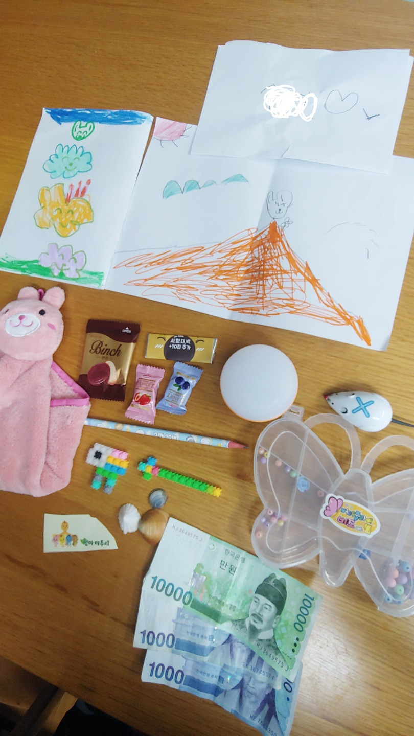 몇 주 전에 문경으로 나들이를 갔다 들른 식당에서 가져온 사탕 두 알, 늘 씹고 싶은 껌 하나, 연필, 비즈 장난감, 토끼 수건, 바닷가에서 주운 조개, 수도요금 용지에서 잘라낸 엄마까투리, 만 이천 원 돈은 오빠가 엄마에게 돈을 준다고 하니 자기도 넣었으리라. 다섯 살 둘째는 자기가 아끼는 것들을 엄마에게 모두 내어주고 엄마의 얼굴을 살폈다.
