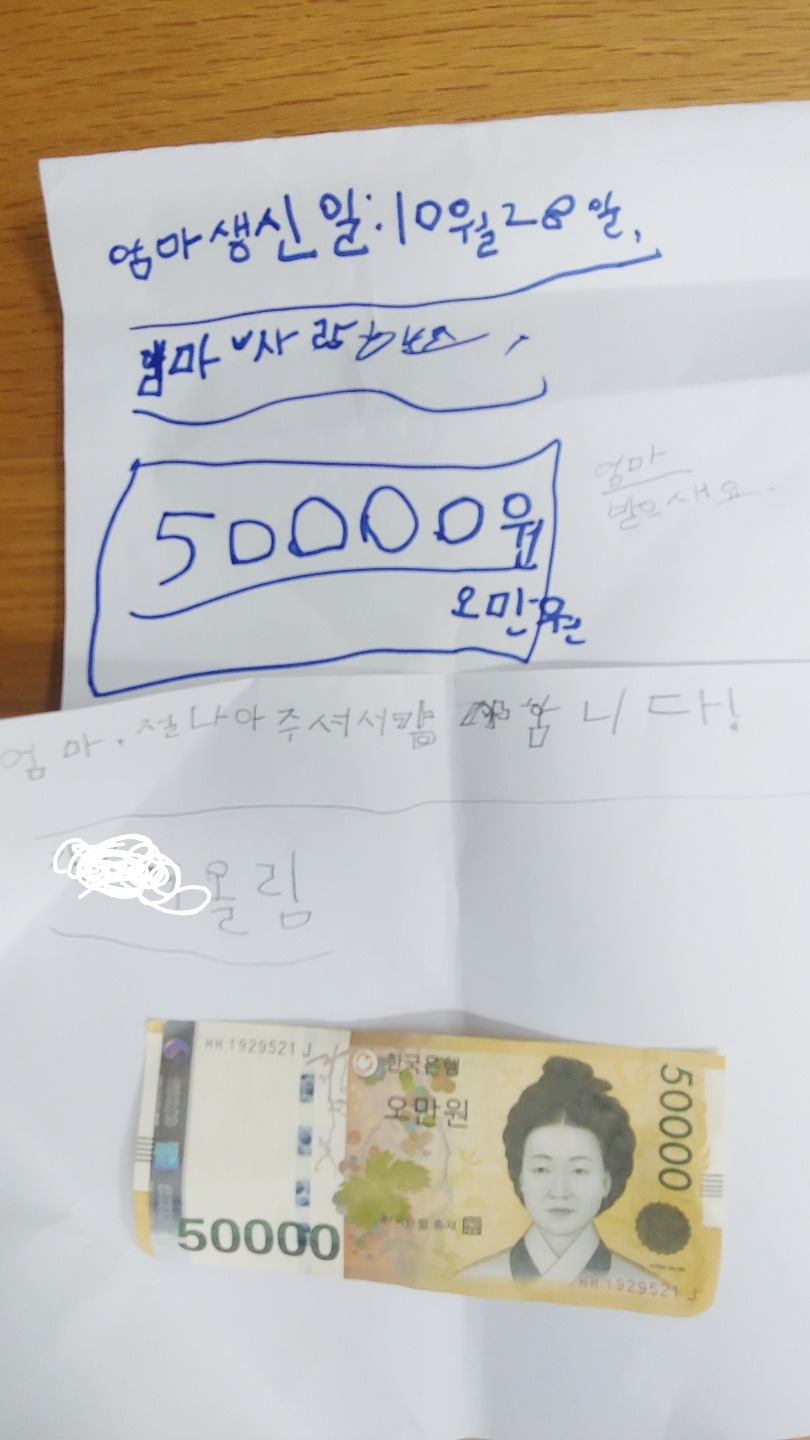 눈을 떠도 깜깜한 정신을 차리느라 뒤척이던 나는 아이들의 선물을 하나씩 펼쳐보았다. '절 나아주셔서 감사합니다'라고 쓴 편지에 노오란 오만 원을 넣었다. 며칠 전부터 엄마는 단지 좀 길게 쓴 편지를 받고 싶다고 했었는데 쿨하게 한 줄을 썼다. 하지만 나는 이미 알고 있었다. 그게 첫째의 스타일인 줄을 말이다.