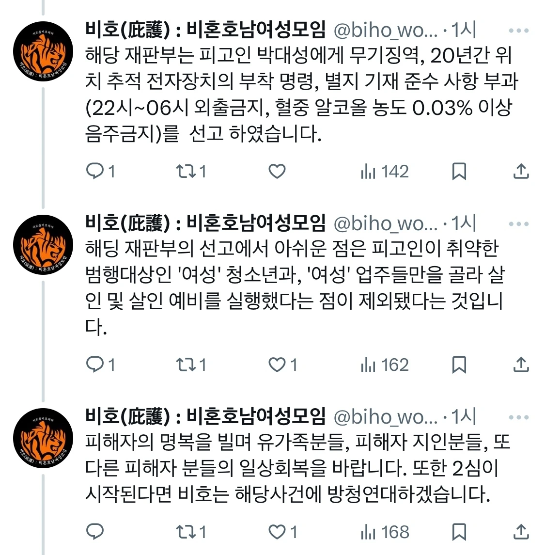 한편, 위 사건의 공판을 지속적으로 살펴보며 SNS에 소식을 전한 ‘비호: 비혼호남여성모임’측은, ‘X(구 트위터)’를 통해 “해당 재판부가 피고인이 취약한 범행대상인 ‘여성’청소년과 ‘여성’업주들만 골라 살인을 시도하려던 점을 제외한 점이 아쉽다”는 의견을 전했으며, 2심 시작 시, 해당 사건에 대해 지속적으로 방청연대할 것이라 밝혔다.