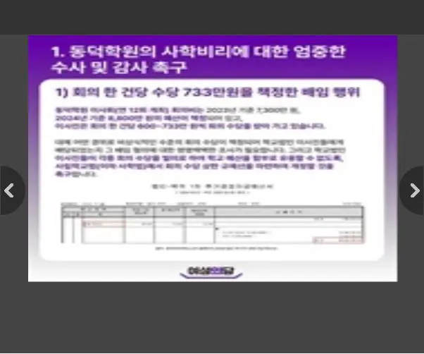 위의 내용은 여성의당 X(구 트위터)를 통해 밝혀진 내용이기도 하다. 여성의당이 밝힌 사학비리의 내용에 의하면, 연 12회 개최되는 동덕학원 이사회 예산은 2023년 기준 7,300만 원, 2024년 기준 8,800만 원으로 책정되어 있었고, 이사진은 회의 한 건 당 600~733만 원씩 회의 수당을 받아가고 있음을 전했다. 그리고 총무처장을 포함한 동덕학원 법인 직원들의 연봉이 1년 만에 40% 인상되었다는 사실을 ‘동덕여대 법인 경정 자금 예산서’ 자료와 함께 제시한 바 있었다.