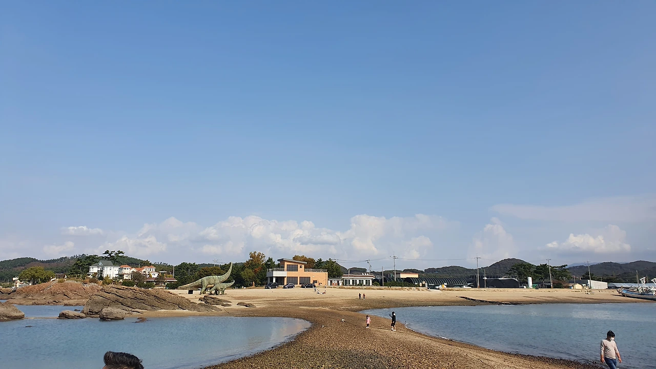 공룡 세마리가 저렇게 버티고 있는 것 만으로도 아이들에겐 큰 관심의 대상이 되었다. 이렇게 물길이 열리려면 시간을 잘 맞춰야 하는데 우리는 운이 좋게 물길 열려있을 때 와서 바다건너까지 가볼 수 있었는데, 발자국화석은 찾지 못했다. 찾으러 출동하기도 전에 우리집 망아지가 바닷속 탐험을 가셨기 때문에...
