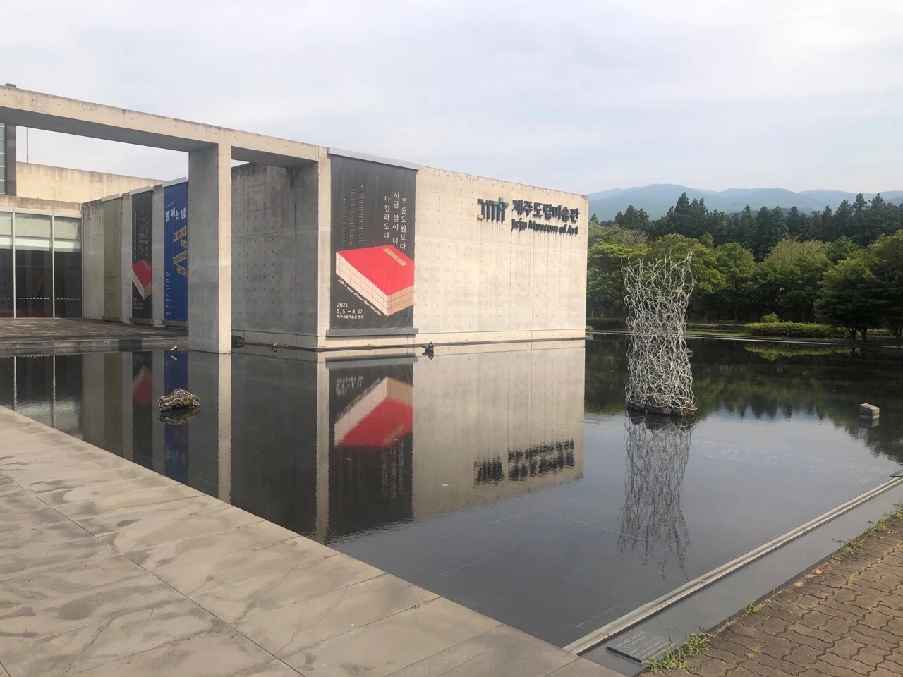 렌트카를 찾고 공항에서 가까운 솔지식당에서 기막힌 멜조림에 고기를 추가추가추가해가면서 먹고 가까운 거리에 있는 제주도립미술관으로 향했다. 이번 여행의 첫 미술관!! 15분 정도 걸려서 도착한 제주도립미술관은 입구부터 아우라가 상당했다. 널찍하고 시원하게 뻗어있는 마당과 건물이 물을 사이에 두고 조화를 이루어 멋있어 보이기도 더 넓어보이기도 했다.