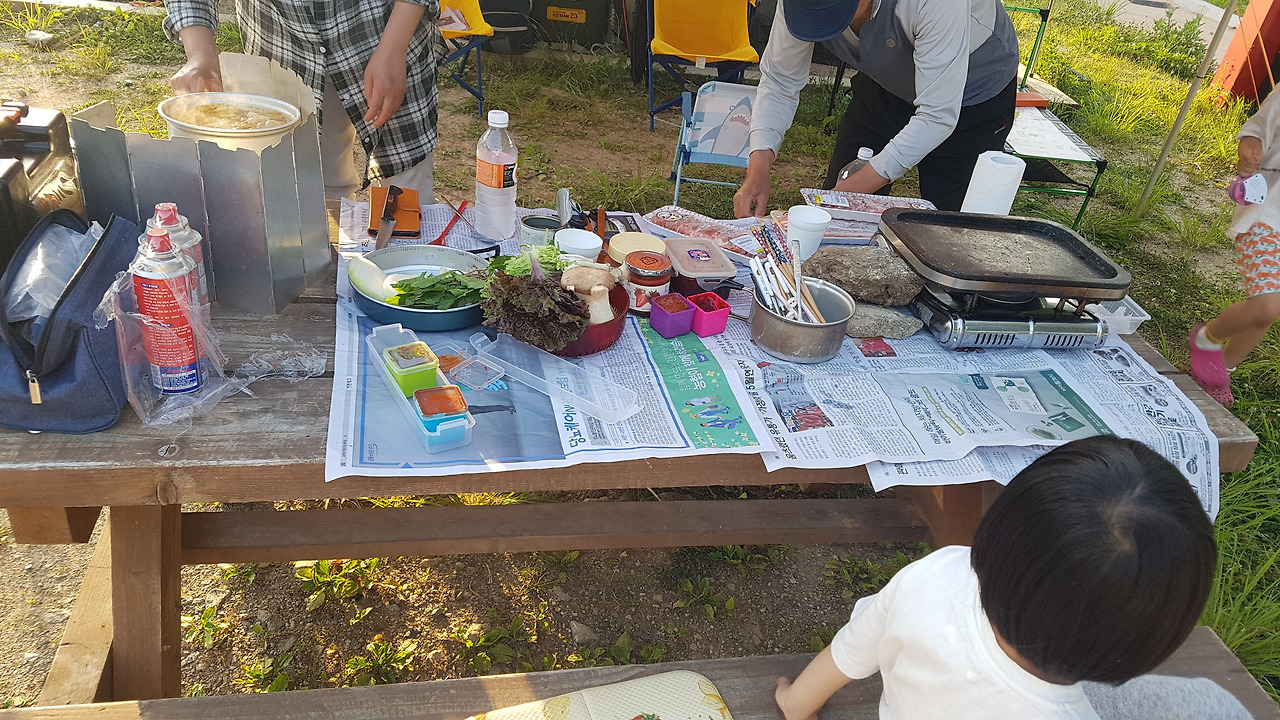 아이가 상석을 차지하는 바람에 방황하는 아빠의 몸ㅋㅋ 캠핑에선 언제나 진수성찬!! 애들은 뛰어놀다 와서 한 입, 또 놀다 와서 한 입, 계속 먹고 싶으면 계속 먹던지 말던지^^