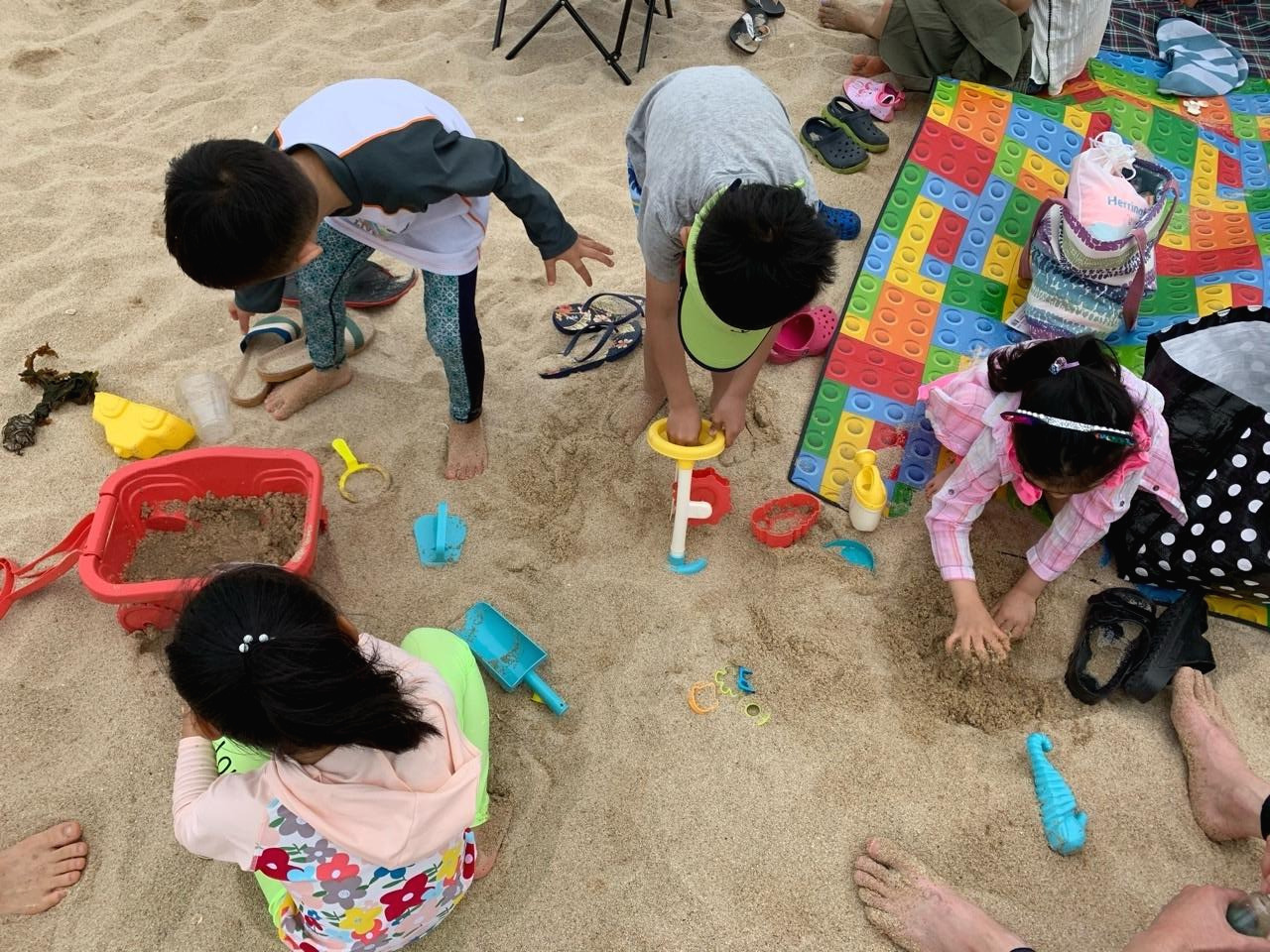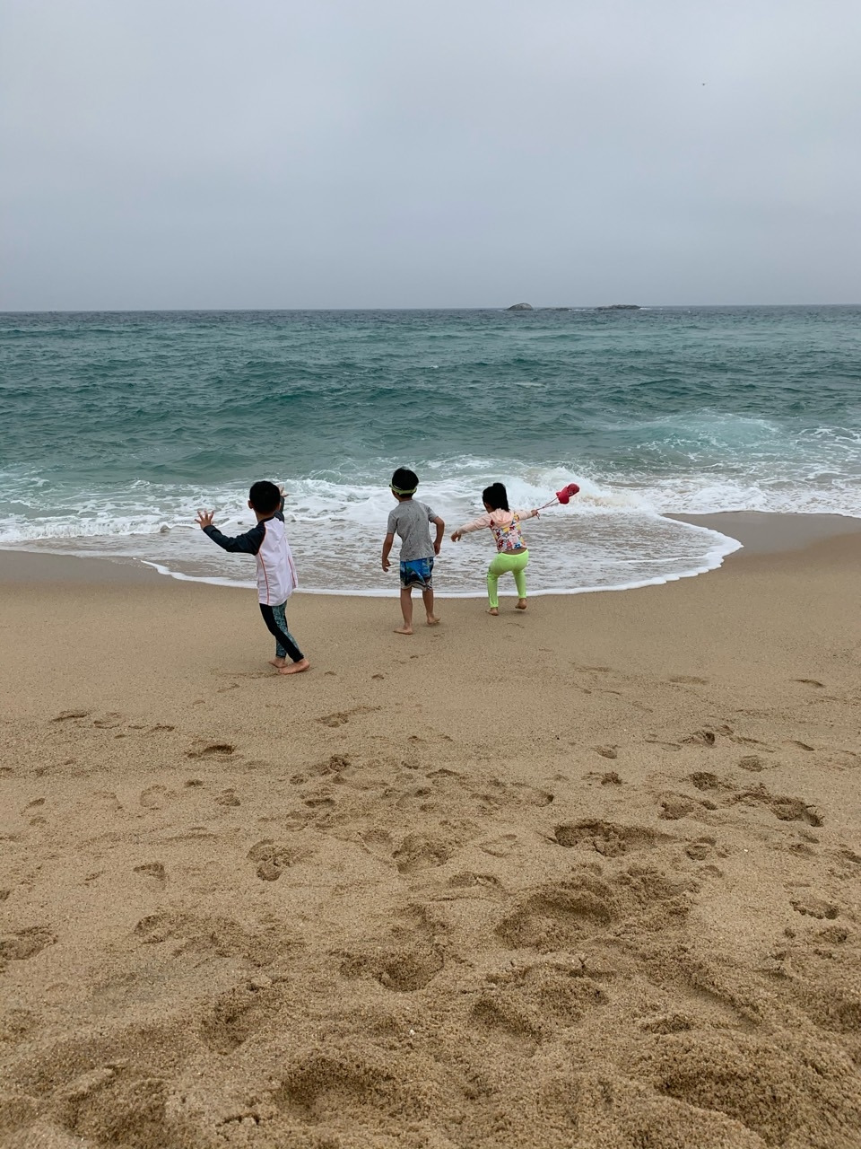 경포해변은 우리가 있었던 숙소에서 산책로로 이어져 있어 이동하기가 정말 편했다. 168걸음 정도 걸으면 되었다. 한 가족씩 따로 휴가 와서 애들 놀아주고 모래 털어주고 씻기고 하려면 그것도 일인데, 다 같이 놀고 다 같이 씻기니 모든 과정이 "노는 일"같았다. 물론 귀찮고 에너지가 빠지는 일이긴 하지만.