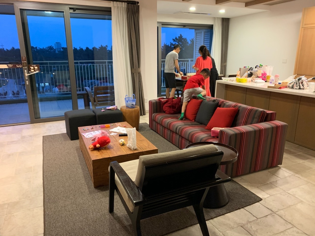 밖에서 놀다가 저녁이 다 되어 입실하는 바람에 오션뷰는 다 놓쳤는데 수영장 뷰가 오션뷰 부럽지 않았다. 수영장 뷰도 완전 멋졌고 동남아에 온 듯한 느낌도 받았다. 테라스도 엄청 넓어서 아이들 수영복 말리기 편했고 미취학 아이들 넷이 꼬리 잡고 뛰어도 부담스럽지 않을 정도의 규모였다.