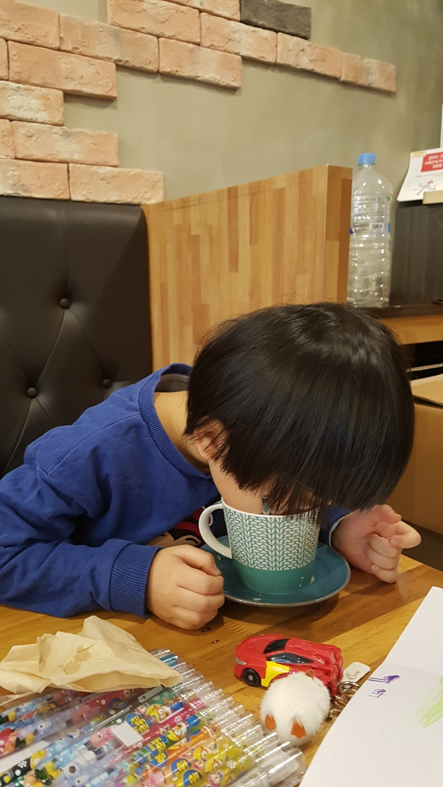 유일한 외출은 고구마 라떼가 있는 카페였고, 나도 이렇게 얼굴 파묻고 먹고 싶다. 다행히 손님이 없었고, 아이들은 그림 그리기와 스티커 붙이기를, 나는 커피와 약간의 독서를 즐길 수 있었다. 단골이라 그런지 사장님은 자꾸 나보고 셋째 낳으란다. 하도 그러셔서 턱밑까지 "사장님이 키워주실 거에요?"라는 말이 받치는데 아직 내뱉진 못했다. 사장님의 따님은 아들 하나 있는데, 맞벌이로 힘들게 사는 걸 보니 둘째 낳으란 말을 못 하시겠단다. 아니, 저도 맞벌인데요? 남은 다 편하고 걱정없이 사는 줄 안다.