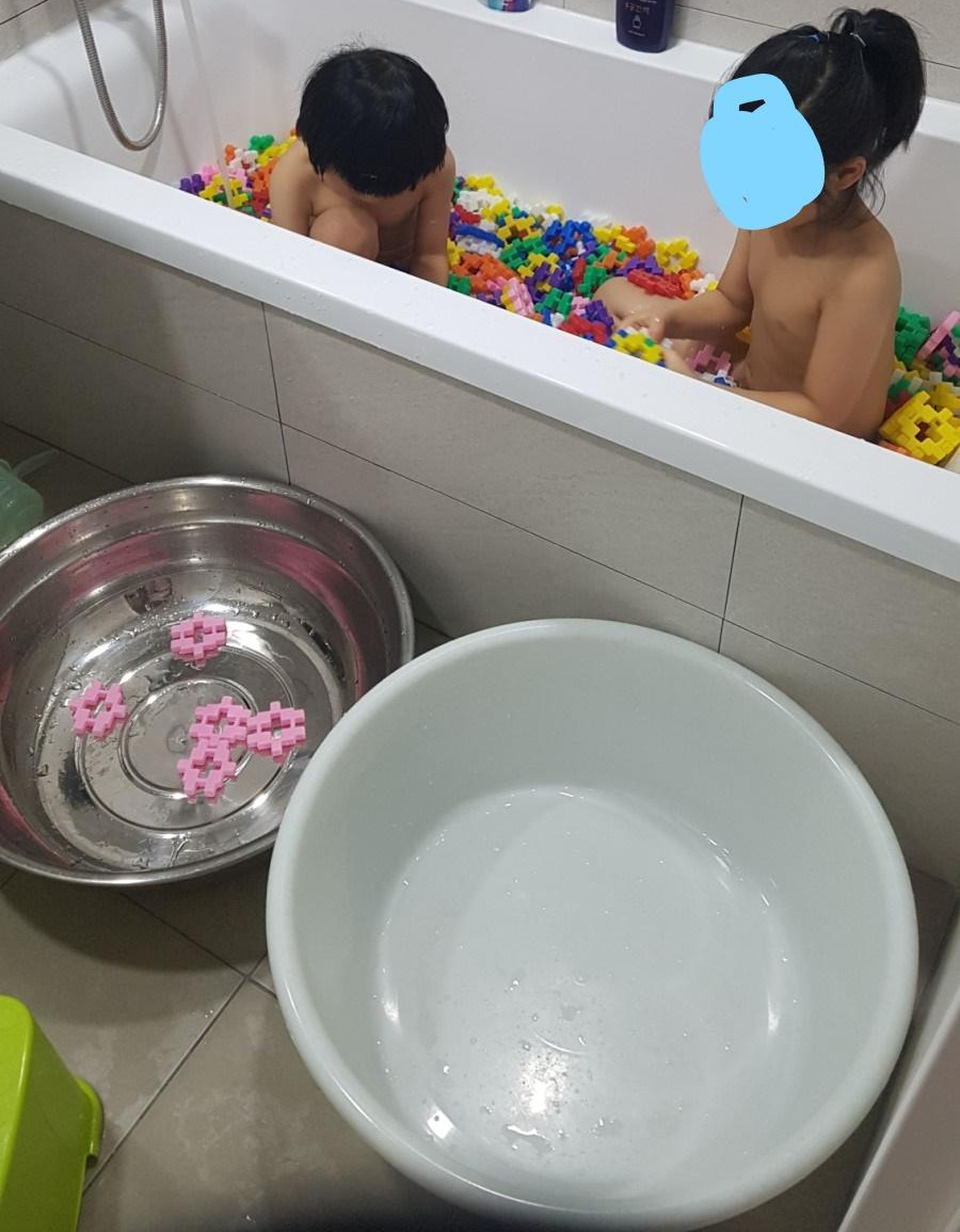 분리수거있던 날 버려져 있던 천재블럭상자를 들고 왔다. 아이들 씻을 때 같이 씻기라고 했다. 그 날은 1시간 정도 쉴 수 있었다. 대박.
