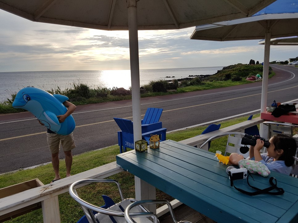 가끔 돌고래떼가 나타나기도 한데요. 그래서 카페에서 저런 망원경을 대여해주시기도 합니다. 돌고래 풍선(?)도 있고요- 한 3년전인 것 같은데, 혹시나 그 사이에 달라진게 있을런지도 모르겠습니다.