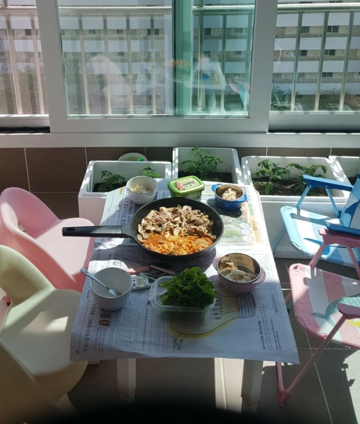 베란다 있는 집의 로망. 집에 브루스타가 없어서 가스렌지에서 구워다가 날랐다. 정면에서는 앞동 뷰지만 약간 측면으로 보면 산이 보인다. 나름 운치있었다. 지금은 저 옆에 심어놓은 방울토마토가 많이 자라서 이때처럼 식사하기는 조금 부담스럽지만 코로나 시대에 나름 낭만적이었던 이벤트로 기억에 남아 있다.