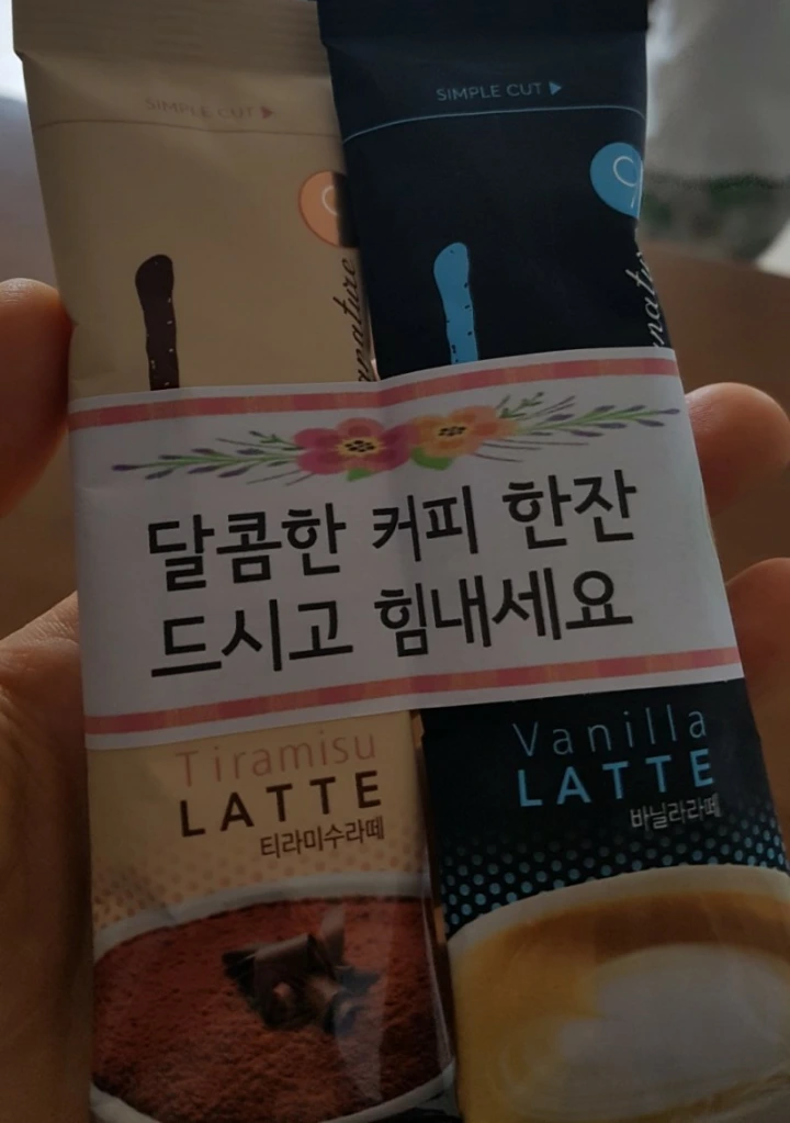둘째 어린이집에서 놀잇감 꾸러미를 보내주셨다. 그 안에 센스있는 커피 선물도 있었다. 저런 식상한 문구가 눈물날 듯 감사했던 건 처음이었다. 커피 타서 젓다가 눈물이 날 뻔했다. 그냥 커피도 아니고 달콤한 커피, 건강을 위해 여러 잔 말고 한 잔, 힘내시라고.. 정말 힘내야지. 감사하다. 서로 간의 응원이 필요했던 시기였다.