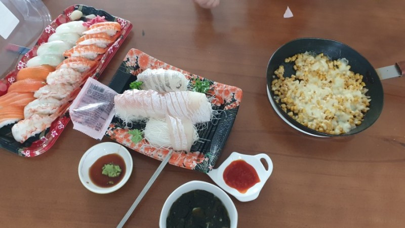 다행히 대형마트 쉬는 날이 아니라서 초밥과 회를 살 수 있었다. 너무 먹고 싶었던 나머지 집-마트에서 초밥사기-집까지 20분도 안걸렸던 것 같다.