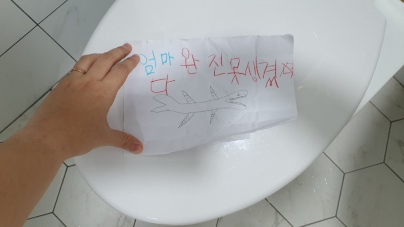 아이들의 취침시간이 늦으면 늦어지는 만큼 나도 신경이 곤두서고 힘들다. 그 날은 아마 아이들보다 내가 먼저 잠들었을지도 모른다. 아침에 일어나서 화장실에 갔더니 저렇게 편지가 있는거다. 어젯밤에 딸아이가 아침에 보라고 한 편지가 저거구나 싶었다. 놔둬도 꼭 변기위에.... 하긴, 그래야 잊지 않고 보겠다 싶긴 했다.