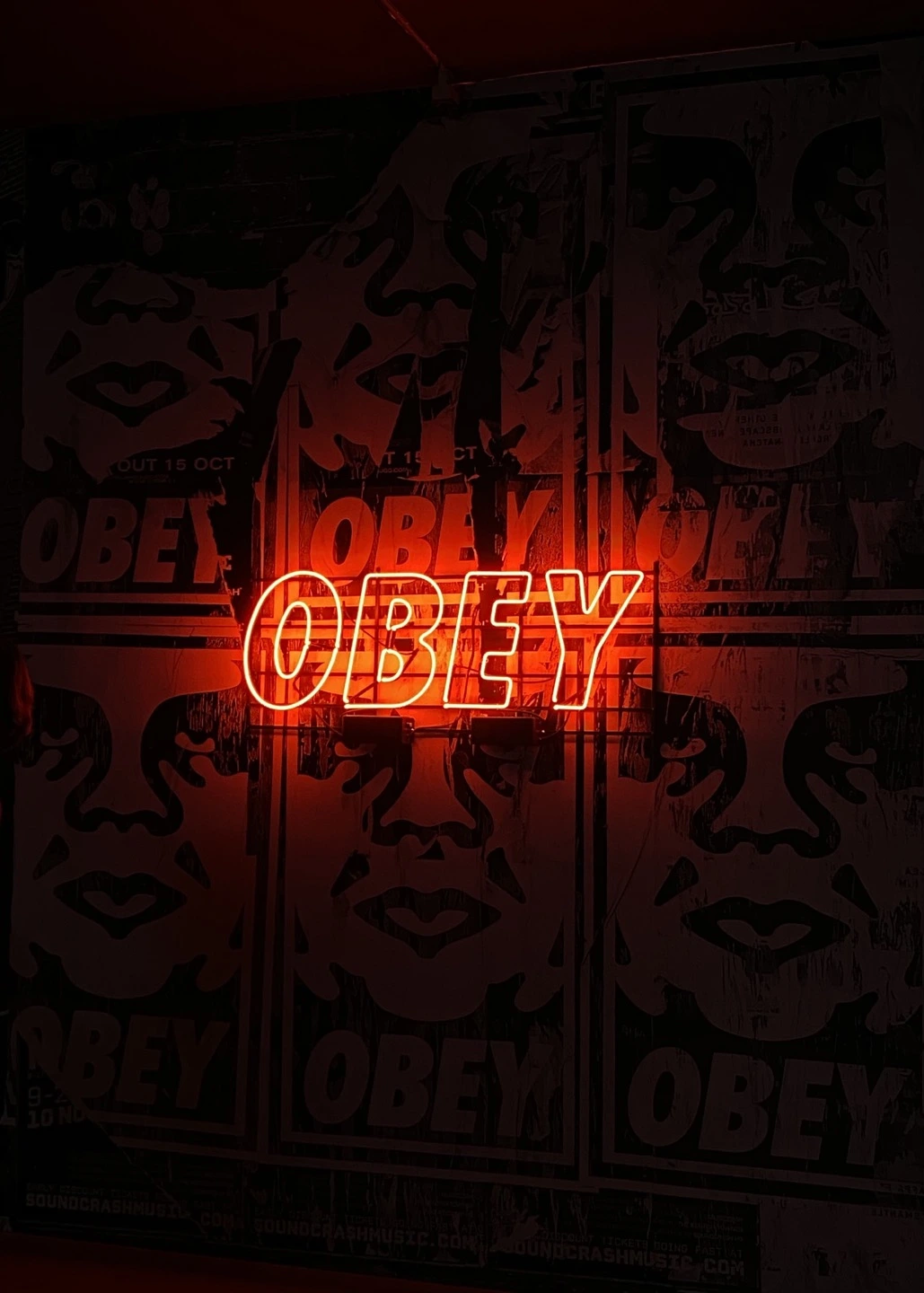 거의 모든 작품속에서 OBEY가 눈을 부럽뜨고 환경오염의 주범, 차별, 전쟁, 사회악들에 맞서고 있는 것 같아, 보는 사람으로 하여금 저절로 계몽되어지는 느낌을 들게 하니 이는 소리 없는 외침이 분명했다.
