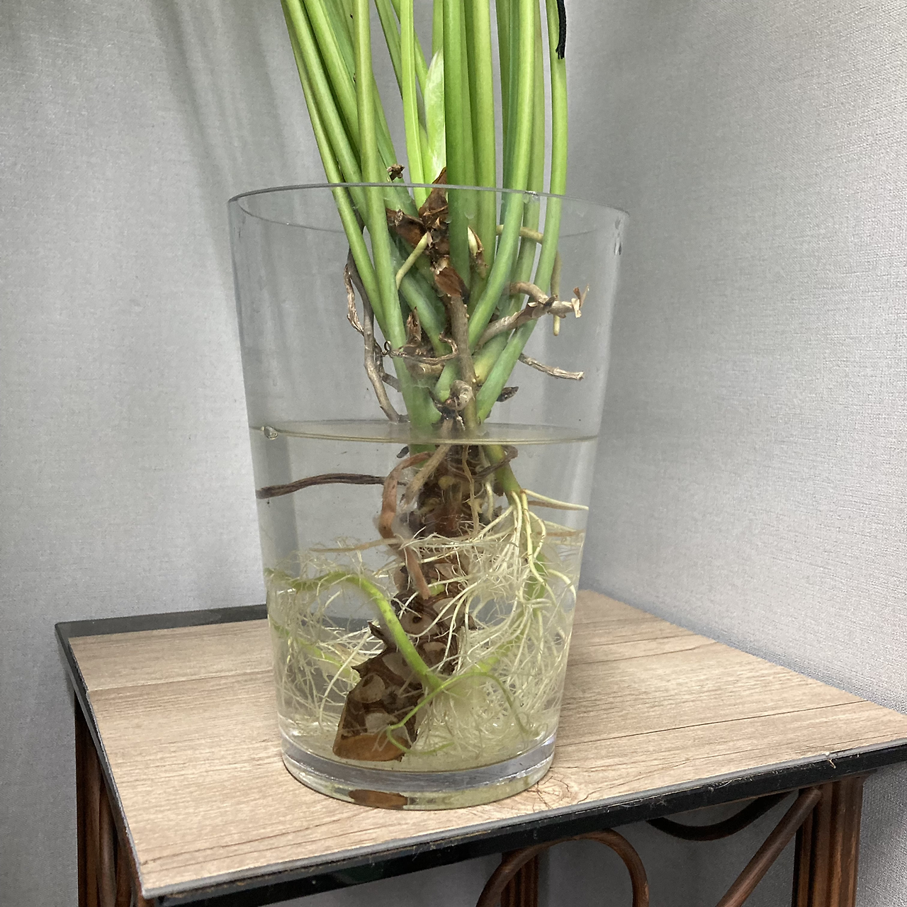 셀렘은 너무 많이 자라서 회의실의 좌석을 방해하는 지경이 됐다. 저 화분을 없애자는 말이 많아지자 나는 집으로 가져올 수도 없어서, 몇 줄기를 잘라내 물꽂이 해주었더니 한달이 지나자 뿌리가 무성하게 자란 걸 보고 정말 신기해했다. 저러다가 한 달도 안되 죽겠다고 생각했고. 기르는 사람이 이런 마음이면 더 죽을 것이라고 확신했는데 내 마음을 이겼다. 그리고 그 마음을 이겨줘서 너무 좋았다. 집에와서 물꽂이 했던 걸 화분으로 옮겨 심었는데, 발산하는 자태가 좁은 우리집과는 어울리는 것 같지 않았다. 갖고 싶은 사람이 생기면 주려고했는데 마침 관심있는 분이 계셔서 그 집에 선물했다.