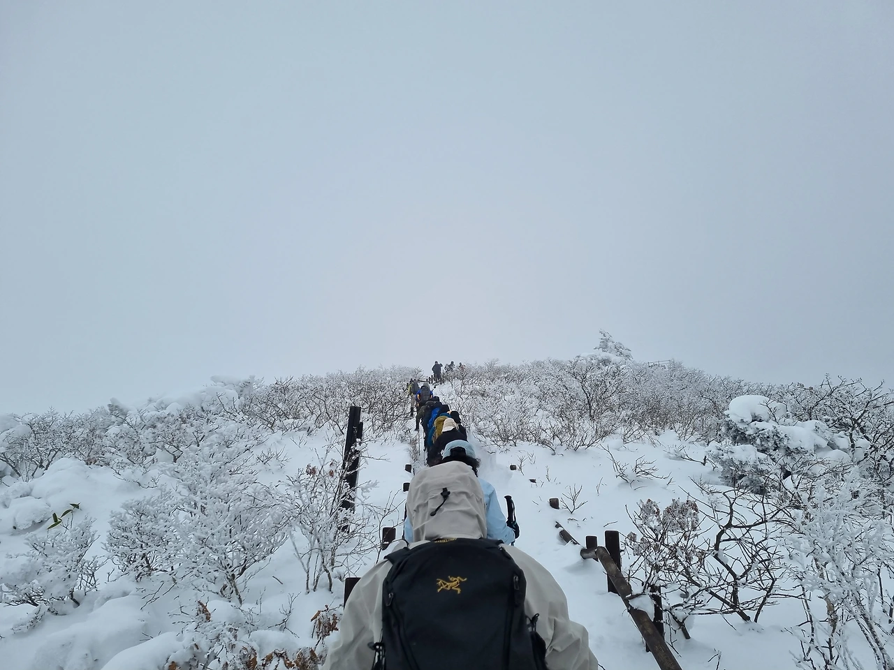 얼떨결에 설산을 올랐다. 등산복도 없고, 아이젠도 배송도 안 오고 스틱도 한 개뿐이라 저런 위험한 산행은 할 수 없을 거라 생각했다. 겁먹은 나의 눈빛을 보고 남편은 백련사까지만 가도 된다고 했다. 백련사 입구에서 방송이 나왔다. '여기서부터 향적봉까지 1시간 30분' 이미 백련사까지 1시간 30분을 오른 상태였다. 그 솔깃한 목소리에 설득되고 말았다.