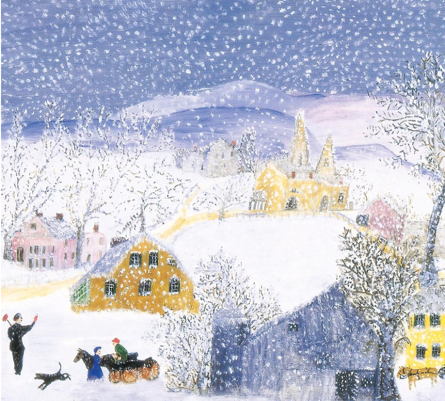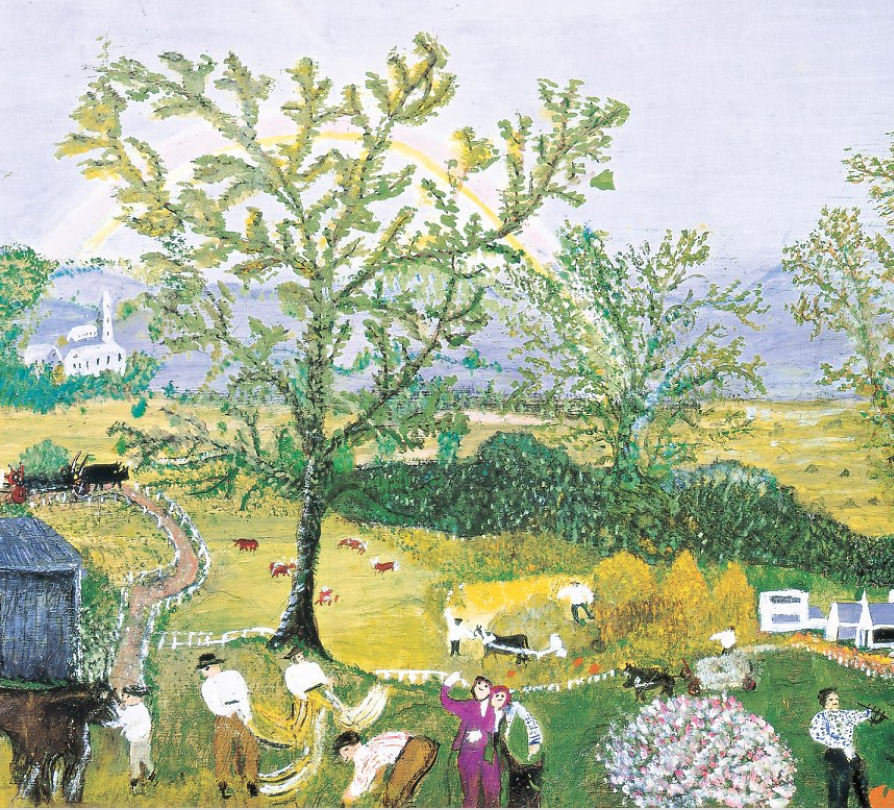 친구에게서 모지스 할머니의 그림이 담긴 책 '인생에서 너무 늦은 때란 없습니다'을 추천받았다. 그림은 할머니가 살고 있는 시골 풍경을 담고 있다. 할머니는 평생을 농장을 가꾸며 살며 소일거리로 자수를 했었다. 그러다 관절염이 생긴 후로부터는 그림을 그렸다. 76세부터 101세까지. 할머니의 작품 속엔 결코 사람과 동물, 건물들이 자연을 압도하는 일이 없다. 인공적인 건 아주 작게 묘사하며 자연이 주는 분위기로 가득하다. 마을 사람들의 생활은 자연의 일부분이다. 할머니가 살아온 삶에 대한 태도가 엿보인다.