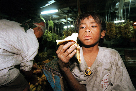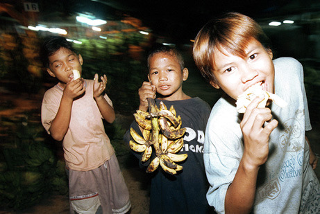 근처 과일 시장에서 판매하고 폐기 처분할 바나나를 아이들이 먹는다.