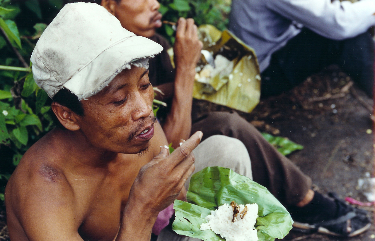 점심시간. 식사는 바나나 잎에 싸온 흰밥과 멸치 같은 반찬이 전부이다.