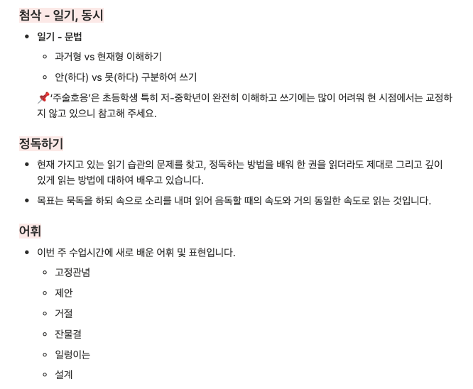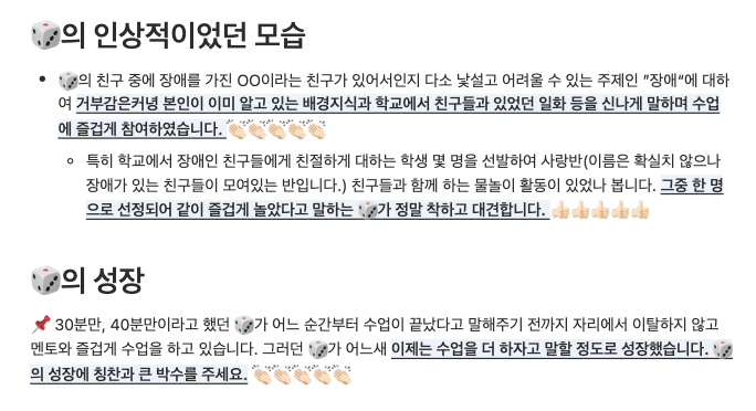 아이들마다 구성은 조금씩 달라지고 수업에 따라 변동되기도 하지만 [인상적이었던 모습]과 [새롭게 배운 것]은 반드시 채운다.