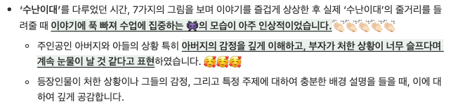 억지로 뭐라도 쥐어짜 내어 쓰기 위해서는 티끌만 한 성장이라도 발견해 보려고 애를 써야 하고, 또 그 성장을 만들어 주어야 하는 사람은 선생님이니 수업 준비에도 더 정성을 들일 수밖에 없다. 내가 준비를 한 만큼 아이들이 말과 글로 보여준다는 것은 진리이기 때문에, 결국에는 또 보고서에 알찬 내용이 가득 담긴다. “어깨를 들썩일 정도로 칭찬해 주세요.”라는 문장에 엄마가 아이를 독려해 주면 인정받은 아이는 또 나와 함께하는 시간에 더 집중해 보려고 노력할 것이다. 결국 이 보고서는 선생에게도 무조건 득이 되는 일이다.