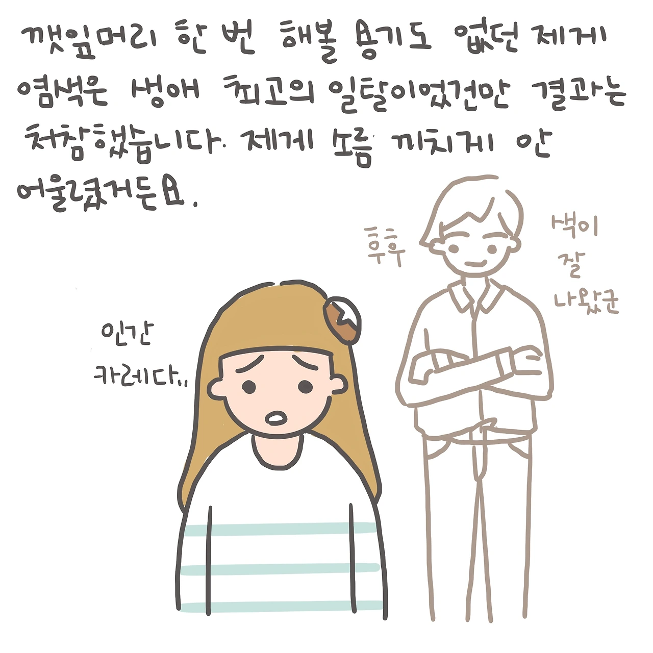 나는 아직 여린 스물 셋이라서, 블루블랙 숏컷에 자주색 립스틱을 바른 미용실 언니에게 대적하지 못했다. 감사합니다… 하고는 어마어마한 커트비를 지불하고 호구처럼 터덜터덜 미용실을 나왔다.