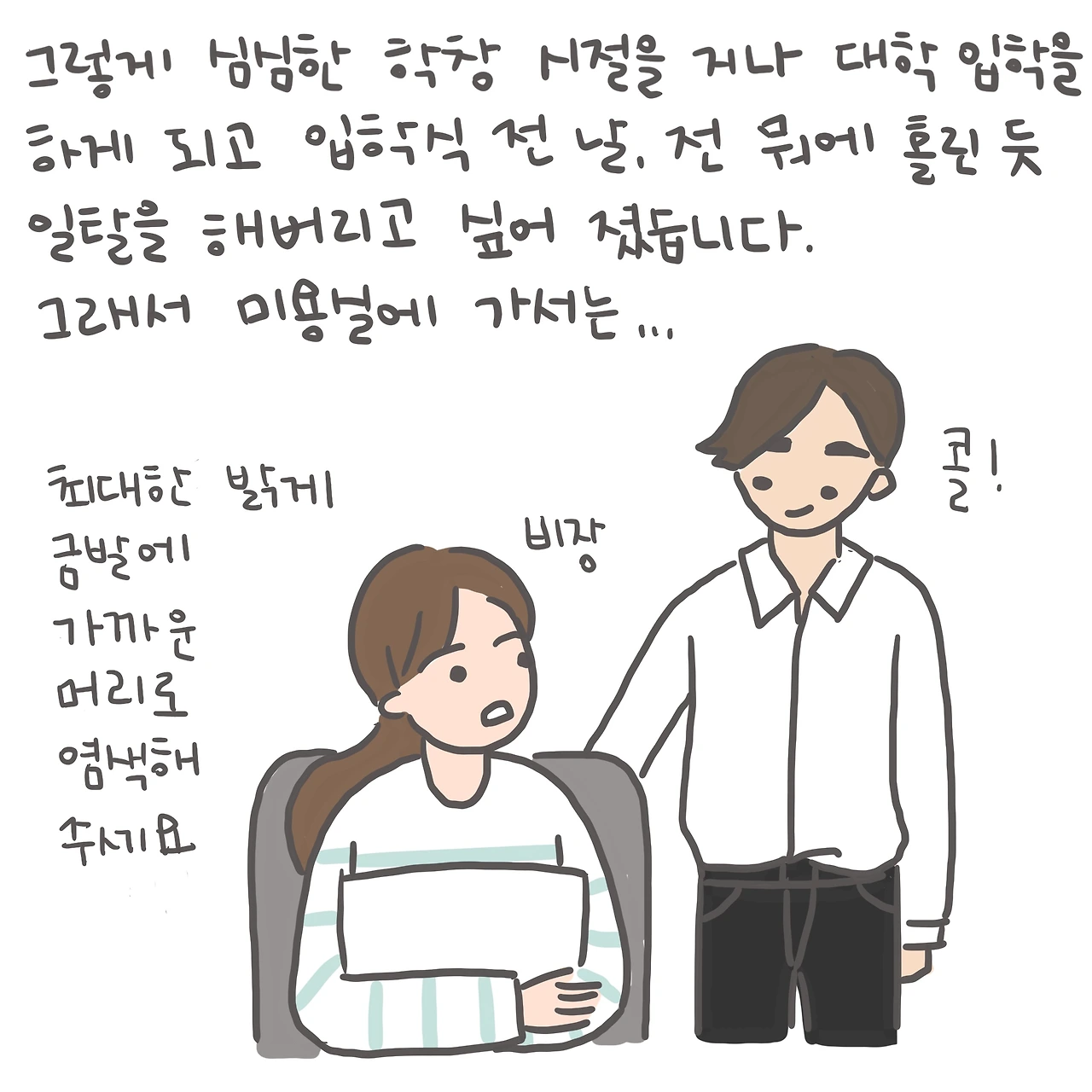 가난한 대학생 신분으로 없는 돈에 압구정 미용실에 가서 커트를 했다. 그런데 미용사는 그 날 첫 데뷔전을 치른 것일까. 굉장한 퍼포먼스형 가위질이 내 뒷머리에서 춤을 추었고, 나는 정확히 '언밸런스 세미 단발컷'이라는 *같은 이름으로 포장된 서비스(=실험)를 받았는데, 그냥 간단히 말하자면 가위 들고 쫓아오는 엄마한테 붙잡혀 머리채 한 쪽만 잘리고 탈출한 꼴이었다. (물론 패완얼 헤완얼이다.)