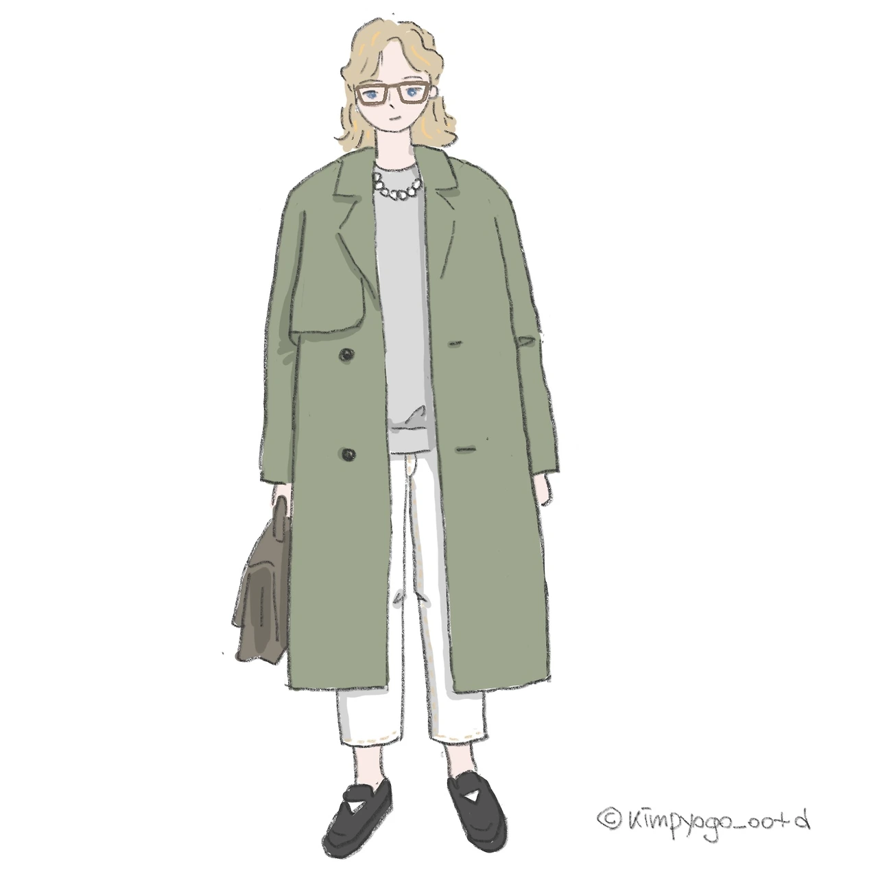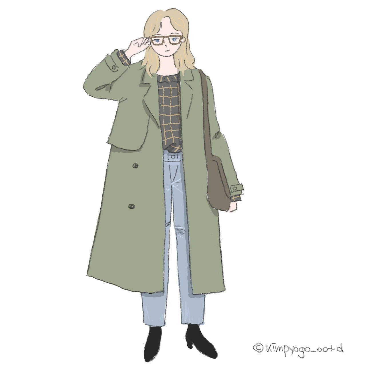 지난 포스팅에서는 베이지색의 일자 라인 트렌치코트로 스타일링을 해보았는데요, 오늘은 오버핏의 카키색 트렌치코트입니다. 이 스타일의 코트는 안에 어떤 실루엣의 옷을 입는지에 따라서 완전히 다른 느낌이 연출 가능하다는 매력이 있는데요. 슬림한 핏의 청바지에 사랑스러운 블라우스를 입으면 멋진 언니 느낌(ㅎㅎ)을 낼 수 있어요. 여기에는 맨얼굴에 가까운 맑은 얼굴에 뿔테 안경을 쓱 써주면 시크한 매력이 더해지지요.