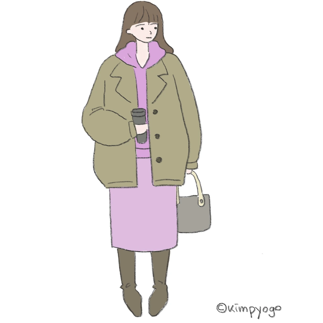 출근룩으로 숏패딩을 활용하실 때는 바지보다는 그림처럼 단정한 디자인의 스커트나 원피스를 매치하시면 더 단정한 느낌을 줄 수 있으니 한 번 도전해보셔요!