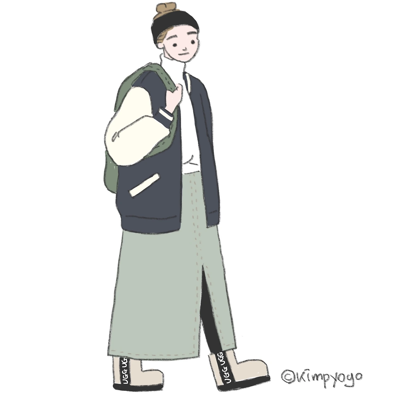 마지막은 귀여운 스타일로 그려보았습니다. 저는 바시티 재킷 혹은 야구 점퍼라고도 하는 점퍼를 오버사이즈로 입는 것을 좋아하는데요, 청바지나 면바지 등에 다 잘 어울리지만, 추위를 막아주는 긴 기장의 스커트에 요즘 다시 핫한 어그 부츠를 매치하면 귀여운 느낌 가득한 룩으로 완성할 수 있답니다. 너무 캐주얼한 거 같아서 잘 활용하지 못하셨다면 그림과 같은 스타일링에 도전해 보셔요!