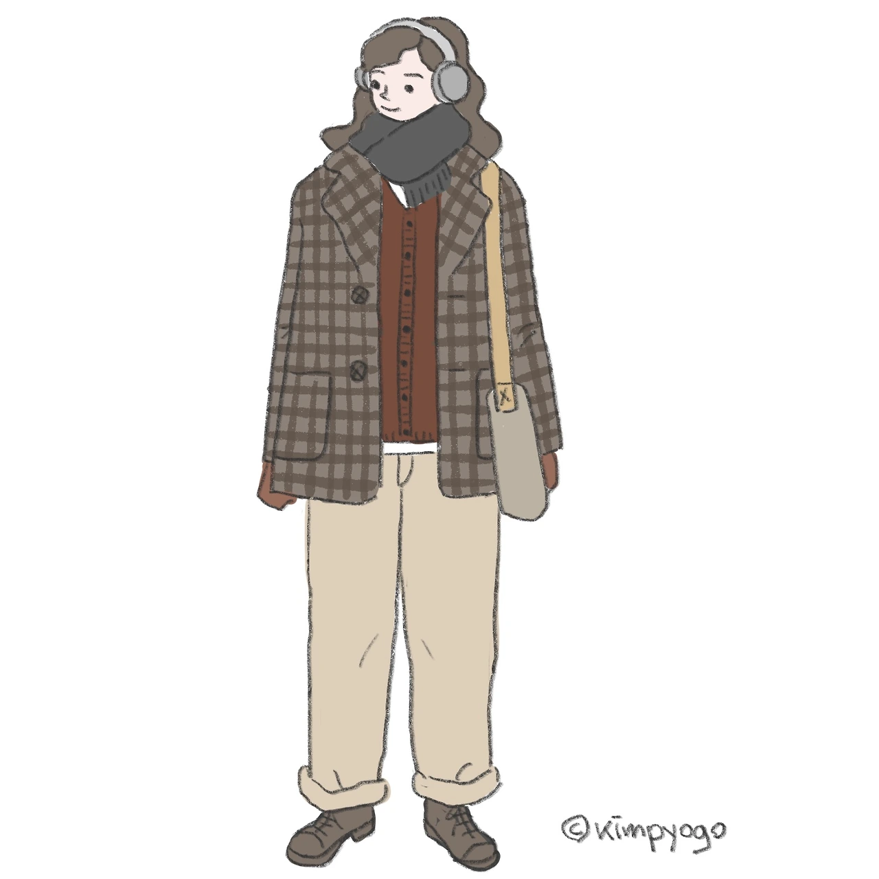 두 번째 룩은 빈티지한 감성의 체크무늬 반코트를 중심으로 스타일링해 보았습니다. 아버지의 옷장에서 꺼내 입은 것 같은 모직 코트는 오버사이즈로 선택하시기를 추천드리는데요, 그림처럼 카디건을 레이어드 하거나, 청자켓을 레이어드해도 예쁜 핏을 유지할 수 있기 때문에 따뜻하게 입을 수 있거든요.^ㅡ^ 빈티지한 감성을 강조하고 싶다면 도톰하고 부드러운 감촉의 면바지를 롤업 해서 매치하면 귀엽고요, 단정한 느낌이 좋다면 이너를 올블랙으로 하고 바지는 슬랙스를 선택하시고 단정한 로퍼를 신어주세요. 코듀로이 소재의 롱 원피스와의 조합도 좋으니 체크무늬가 예쁜 도톰한 모직 반코트 하나쯤 소장하시기를 추천드려요!