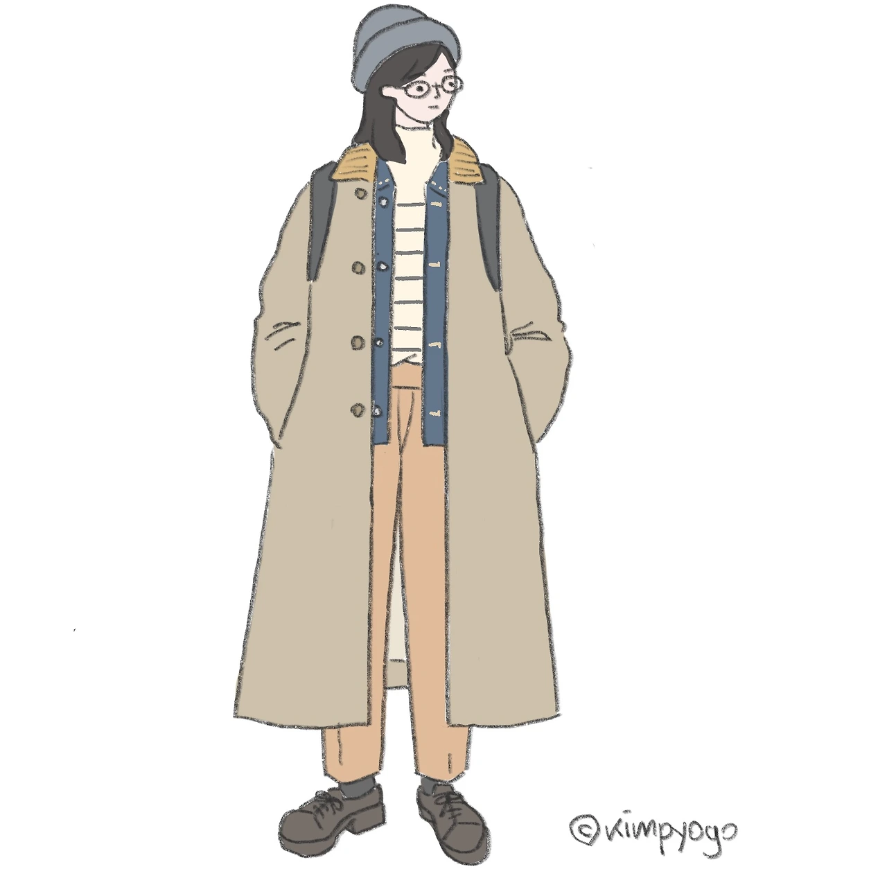 첫 번째 룩은 제가 실제로 자주 입는 스타일입니다. 최근에 안감은 에코 퍼로 되어있고 겉감은 도톰한 면으로 되어있는 코트를 구입했는데요, 패딩처럼 울룩불룩하지 않고 트렌치코트를 입은 것처럼 깔끔한 느낌이 나서 슬랙스랑 잘 어울리더라고요. 코트가 무난한 베이지색인 경우, 그림처럼 색감이 화사한 슬랙스를 추천드리는데요, 무채색이 대부분인 겨울옷들 사이에서 상큼한 포인트가 되면서도 지나치게 멋을 낸 느낌이 들지는 않기 때문입니다.
