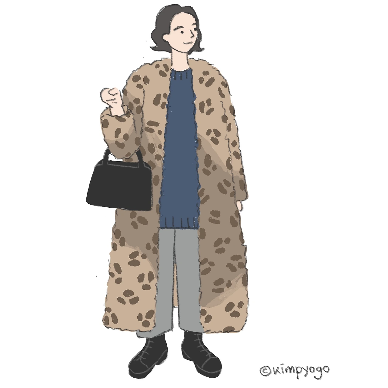 마지막 착장은 스우파 언니들에게 찰떡일듯한 화려하지만 시크한 룩입니다. 그림처럼 호피무늬 퍼 코트는 그 아이템 하나만으로 존재감이 엄청나기 때문에 나머지 아이템을 조심해서 선택하셔야 하는데요. 가장 무난하고 안전한 선택은 이너를 올 블랙으로 통일하는 것이고요, 조금 더 개성을 살리려면 그림처럼 블루 계열의 이너를 매치하는 것도 좋답니다. 뾰족한 코의 구두를 신으면 화려함이 더해지고, 투박한 워커를 매치하면 보이시한 느낌으로 마무리할 수 있습니다. 패턴이 예쁘게 프린트된 호피무늬 퍼 코트는 하나 장만해두면 의외로 질리지 않고 해마다 꺼내 입을 수 있으니, 세일하고 있을 때 잘 살펴보셔요!