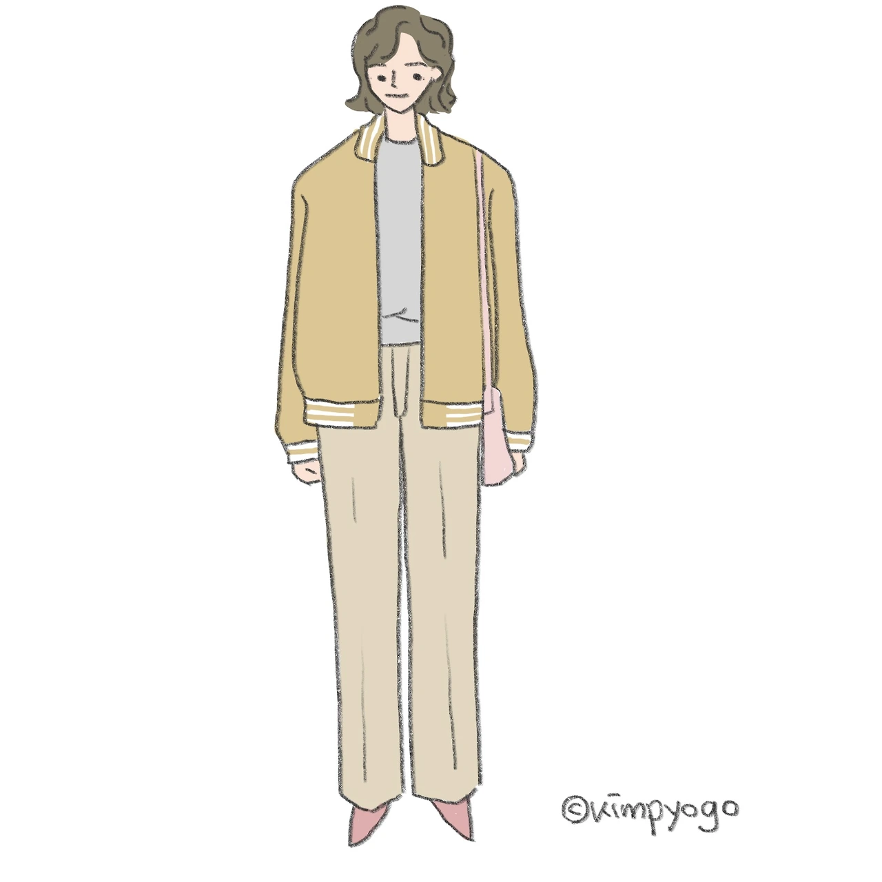 마지막은 포멀 한 스타일링으로 해보았습니다. 바시티 재킷의 스포티한 느낌이 있지만, 어떤 핏과 어떤 색상이냐에 따라서 위처럼 포멀 한 룩의 재킷으로도 활용할 수 있습니다. 평소에 세미 정장을 입으시는 분이라면, 어깨와 팔뚝이 슬림해 보이는 핏의 바시티 재킷을 뉴트럴 톤의 색상으로 선택해 보세요. 톤을 잘 맞추면 셋업 슈트 못지않게 세련되고 모던한 느낌을 낼 수 있습니다. 또한 베이지색을 자주 입으신다면 가방이나 신발을 검정이나 브라운 대신, 화이트나 핑크로 매치해 보시는 것을 추천드리는데요, 사랑스러운 느낌을 주면서도 지나치게 차려입은 듯한 느낌은 덜해서 무심한 매력을 더할 수 있습니다.