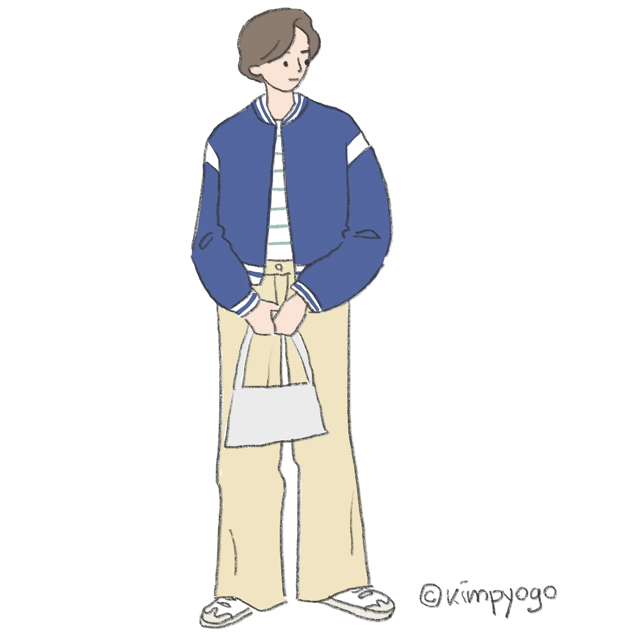 마지막 스타일링은 보이시한 느낌의 착장입니다. 바시티 재킷 중에 크롭 기장의 색감이 쨍한 디자인이 이번 시즌에 많이 선보이고 있는데요, 하이웨이스트 와이드 팬츠와 함께 매치하면 그림처럼 다리도 길어 보이고, 상콤한 느낌을 뿜뿜 낼 수 있습니다. 요즘 상영 중인 영화 <스펜서>에서 다이애나 비의 스포티 + 클래식의 조합인 룩이 예뻐 보이더라고요. 올봄에 어떤 룩을 입을까 고민되신다면 영화 속 스타일링을 참고하셔도 좋을 것 같습니다. ^ㅡ^