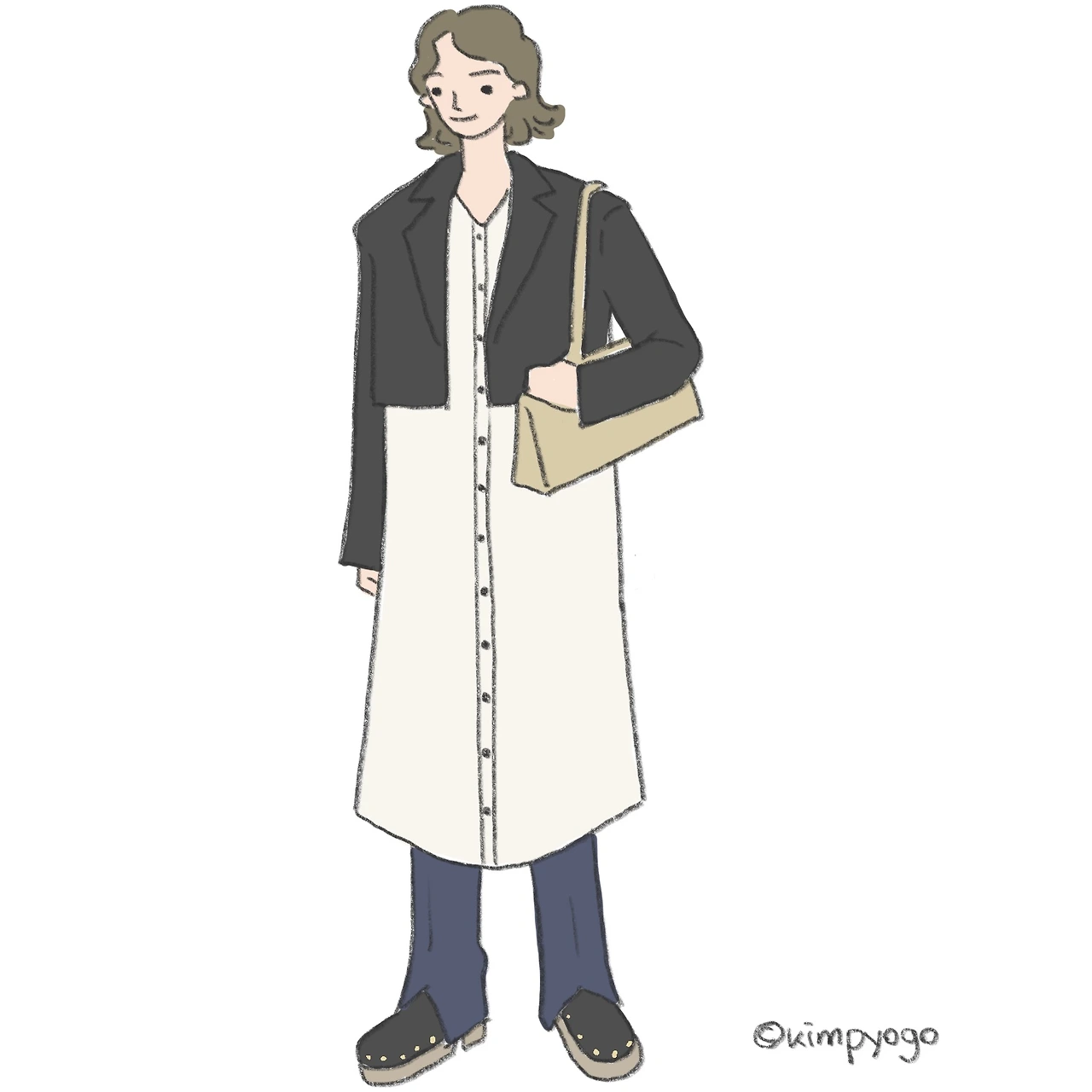 두 번째 스타일은 정장 느낌의 착장입니다. 롱 셔츠 원피스는 그림처럼 아주 슬림하게 툭 떨어지는 슬랙스와 매치해서 입으면 다리를 드러내는 경우보다 오히려 날씬하고 키도 커 보이는 효과가 있답니다. 액세서리는 요즘 대세인 클로그 슈즈와 심플한 숄더백을 매치해 보았는데요. 클로그 슈즈는 포멀한 룩에 약간의 위트를 더하는 효과가 있는 거 같아요. 귀여운 양말을 신고 원피스에 신어도 매력적인 슈즈이죠. 다음엔 클로그 슈즈 스타일링만 특집으로 다뤄볼게요.