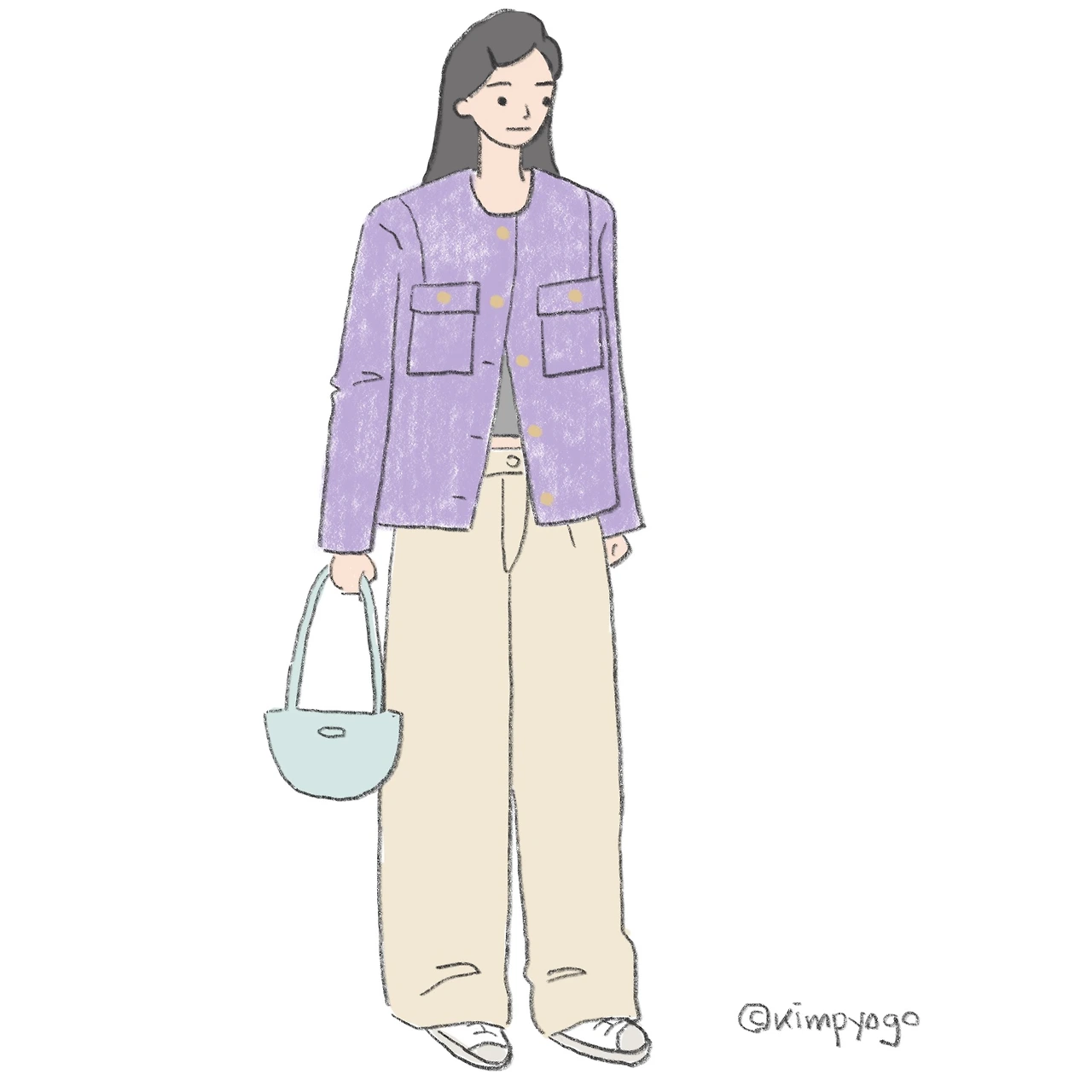 세 번째 착장은 좀 더 드레스 다운해서, 캐주얼한 느낌의 스타일링입니다. 살짝 어깨가 오버사이즈로 된 넉넉한 핏의 트위드 재킷은 와이드 팬츠와 함께 입으면 세상 힙해지는데요. 화사한 컬러의 트위드 재킷을 구입하고 싶으시다면 요즘 가장 핫한 컬러 베리 페리(라벤더 계열 보라색) 추천드릴게요. 왠지 보라색은 어려울 거 같지만, 뉴트럴 톤의 아이템과 매치하면 생각보다 부담스럽지 않게 연출할 수 있거든요. 물론 피부톤과 잘 맞는지 확인해 보셔야겠지요? ^ㅡ^