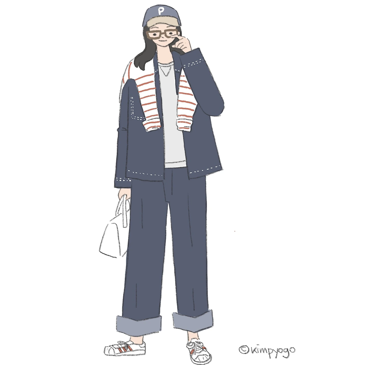 첫 번째 스타일은 생지 데님 셋업입니다. 위 사진의 셋업처럼 루즈한 핏으로 입는 것은 현실에서는 조금 부담스럽기 때문에 적절히 여유 있는 핏에 경쾌함을 더하는 스트라이프 티셔츠를 숄처럼 둘러 포인트를 주었습니다. 생지 데님은 푸른 계열이지만 거의 블랙에 가까운 네이비이기 때문에 대부분의 색상과 매치해도 실패할 가능성이 낮거든요, 그러므로 데님 셋업을 구입하셨다면, 좋아하는 색과 마음껏, 즐겁게 매치해 보시면 좋을 거 같아요.