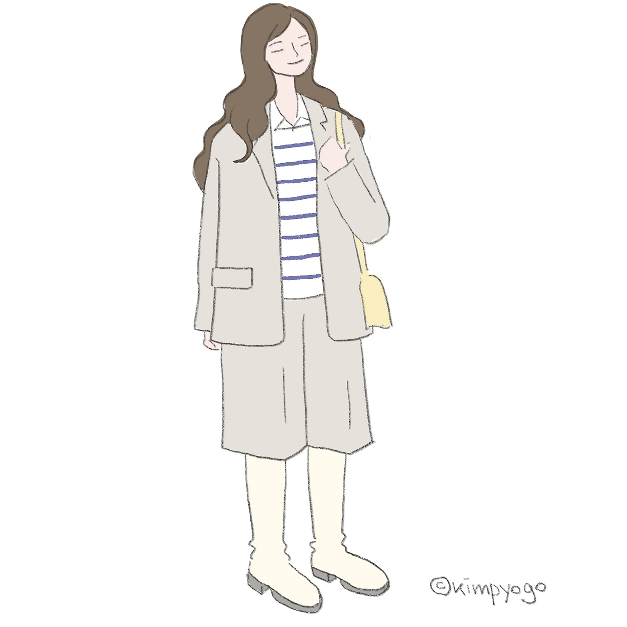 마지막은 쇼츠 셋업 스타일링입니다. 뉴트럴 한 톤의, 조금 오버사이즈 핏의 쇼츠 셋업은 굉장히 보이시한 분위기가 나는데요. 보이시한 분위기의 옷을 입을 때는 긴 머리를 오히려 풀어 페미닌 한 느낌을 더해 발란스를 맞춰주는 것이 멋스럽더라고요. 아직 더워지기 전이니, 밝은 색상의 멋스럽게 구김이 간 부츠와 함께 연출하면 흔하지 않은 스타일로 완성할 수 있으니, 쇼츠 스타일링하실 때 참조하셔요!