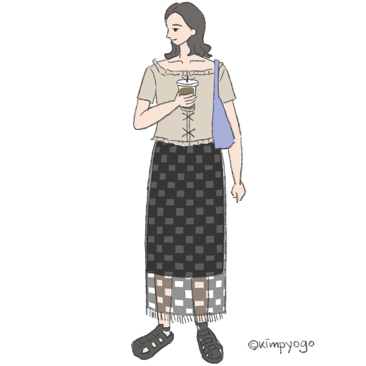 마지막 룩은 70년대 느낌을 살짝 더한 멋스러운 착장입니다. 그림처럼 전체적으로 패턴이 들어간 독특한 스타일의 스커트를 연출할 때에는 전체적으로 색감을 뉴트럴하게 통일하는 것이 부담스럽지 않습니다. 탑과 스커트가 살짝 섹시함이 느껴지는 디자인인데요, 이런 경우 그림처럼 투박한 디자인의 글래디에이터 샌들이나 피셔맨 샌들을 매치하는 것이 오히려 멋스럽답니다. 올해 이런 스타일의 신발이 유행이라 예쁜 디자인이 잔뜩 나오고 있으니, 하나쯤 마련하시는 것도 추천드릴게요!