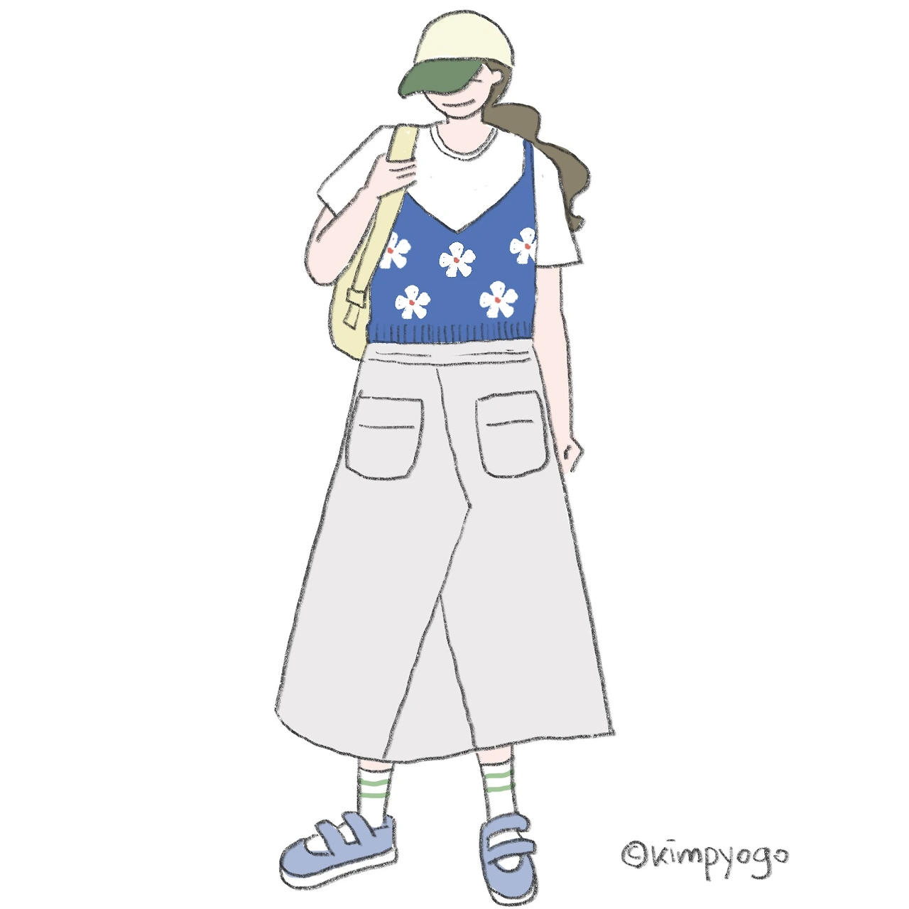첫 번째 스타일은 경쾌한 느낌의 룩입니다. 그림과 같은 저지 소재(츄리닝 느낌의 소재)로 된 스커트는 홈웨어 느낌이 날 수 있는데요, 색감과 패턴이 예쁜 베스트로 포인트를 주면 전체적으로 캐주얼하지만 외출복으로 손색이 없는 룩으로 완성할 수 있답니다. 캐주얼한 룩을 좋아하시는 분들의 나들이 복장으로 추천드립니다.