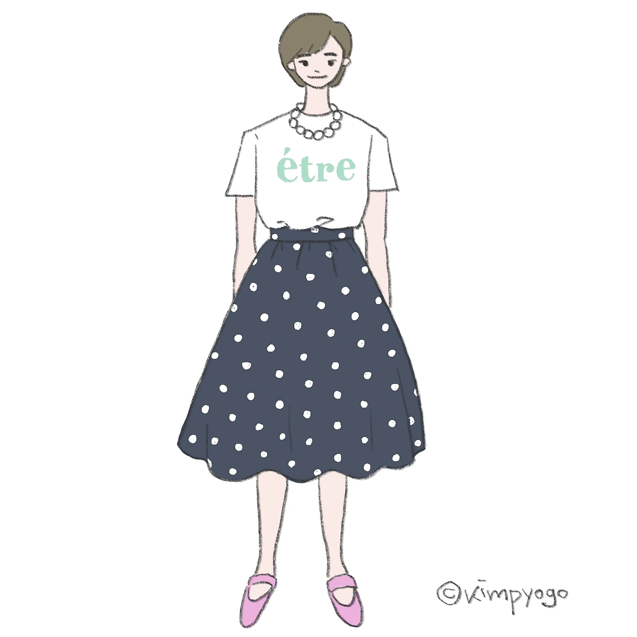 세 번째 룩은 사랑스러운 느낌으로 연출해 보았습니다. 그림과 같은 도트 패턴이 들어간 풀스커트는 오드리 헵번이 떠오르는 매우 클래식한 아이템인데요. 어떤 것과 매치하느냐에 따라서 지나치게 화려한 느낌이 들 수 있습니다. 화려 해지는 것이 부담스럽다면 그림처럼 예쁜 폰트의 글씨가 큼직하게 들어간 캐주얼한 탑을 입어보세요. 전체적인 룩을 드레스 다운시키면서도 발랄하고 사랑스러운 룩으로 연출할 수 있습니다.