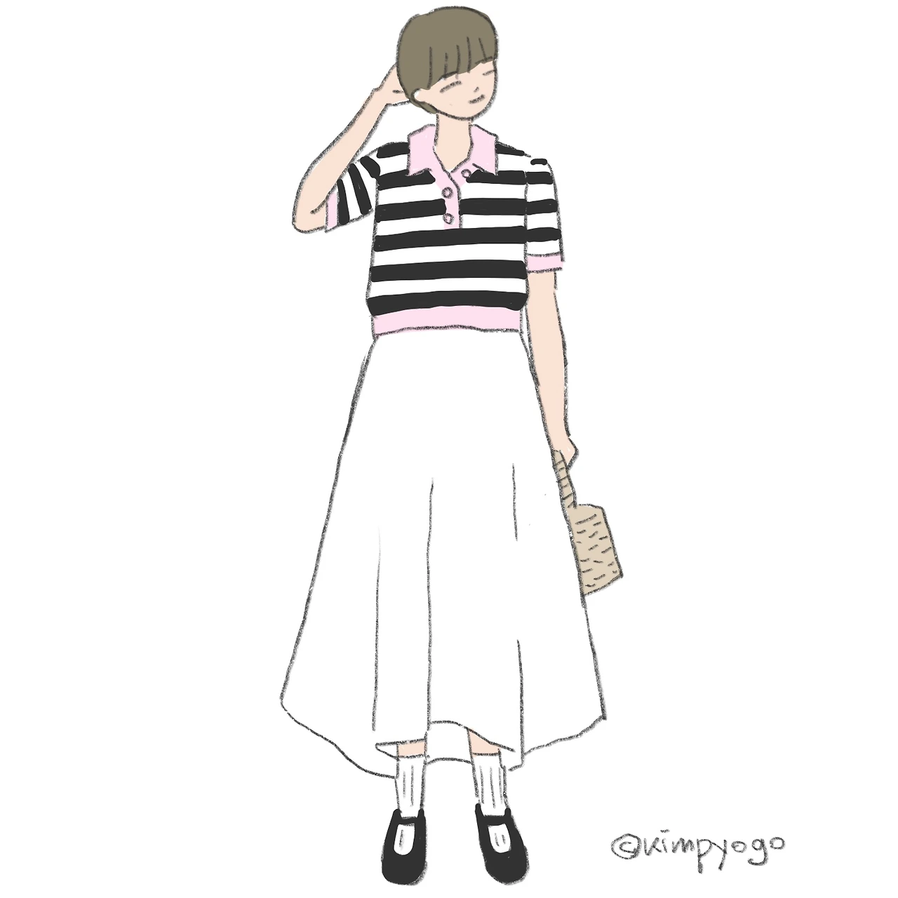 두 번째 착장은 좀 더 단정한 느낌의 캐주얼 룩입니다. 화이트 풀스커트는 보통 여성스러운 블라우스에 많이 매치하시는데요, 그림처럼 패턴이 들어간 피케 셔츠와 매치하고 메리제인을 신으면 귀여운 캐주얼룩으로 연출할 수 있습니다. 더 더워지기 전에 위와 같이 입고 한강공원에 나들이 가면 좋겠죠?