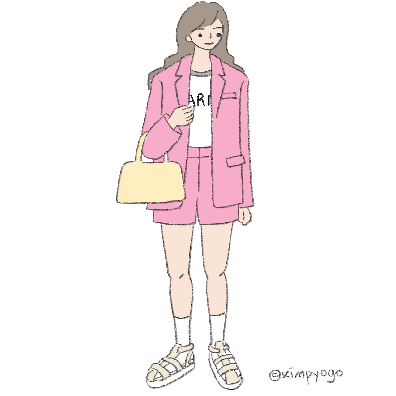 마지막 착장은 세미 캐주얼 스타일 룩입니다. 재킷과 쇼츠가 세트로 되어있는 셋업은 다른 아이템과 바꿔서 믹스 매치하기가 수월하기 때문에 그림처럼 튀는 색상을 하나쯤 마련하시는 것도 좋습니다. 쨍한 컬러의 쇼츠와 화이트 셔츠 조합이나 화이트 원피스에 쨍한 컬러 재킷 조합은 심플하지만 세련된 느낌의 룩이라 누구나 부담 없이 입을 수 있답니다. 단, 가지고 계신 옷들의 색상이 주로 어떤 톤인지를 고려해서 (쿨톤인지 웜톤인지로 구분해 볼 수도 있겠지요.) 더 잘 어울릴 색상을 고민하신 후 구입하신다면 더 좋겠죠?