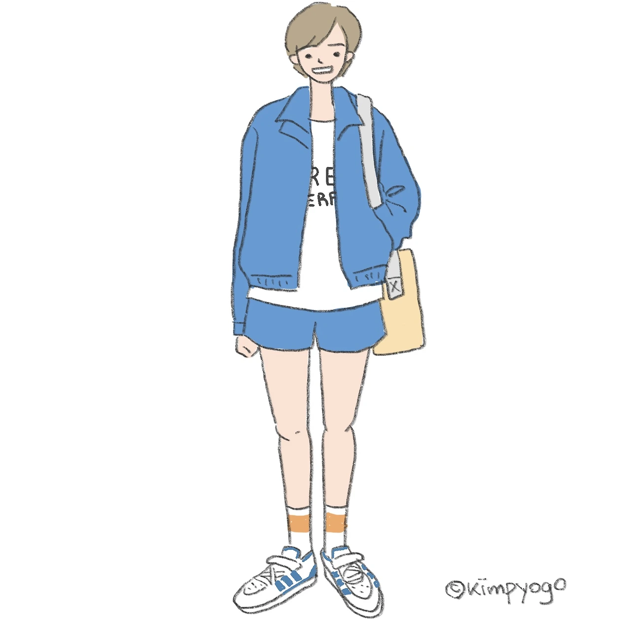 세 번째 룩은 바람막이 점퍼와 쇼츠가 세트인 착장입니다. 이렇게나 쨍한 블루 컬러는 여름에 가장 어울리는 컬러가 아닐까 싶은데요. 바지까지 긴 셋업을 이렇게 쨍한 컬러로 입는 건 좀 과해 보이니까요, 위처럼 바지는 쇼츠로 입으시는 걸 추천드릴게요.